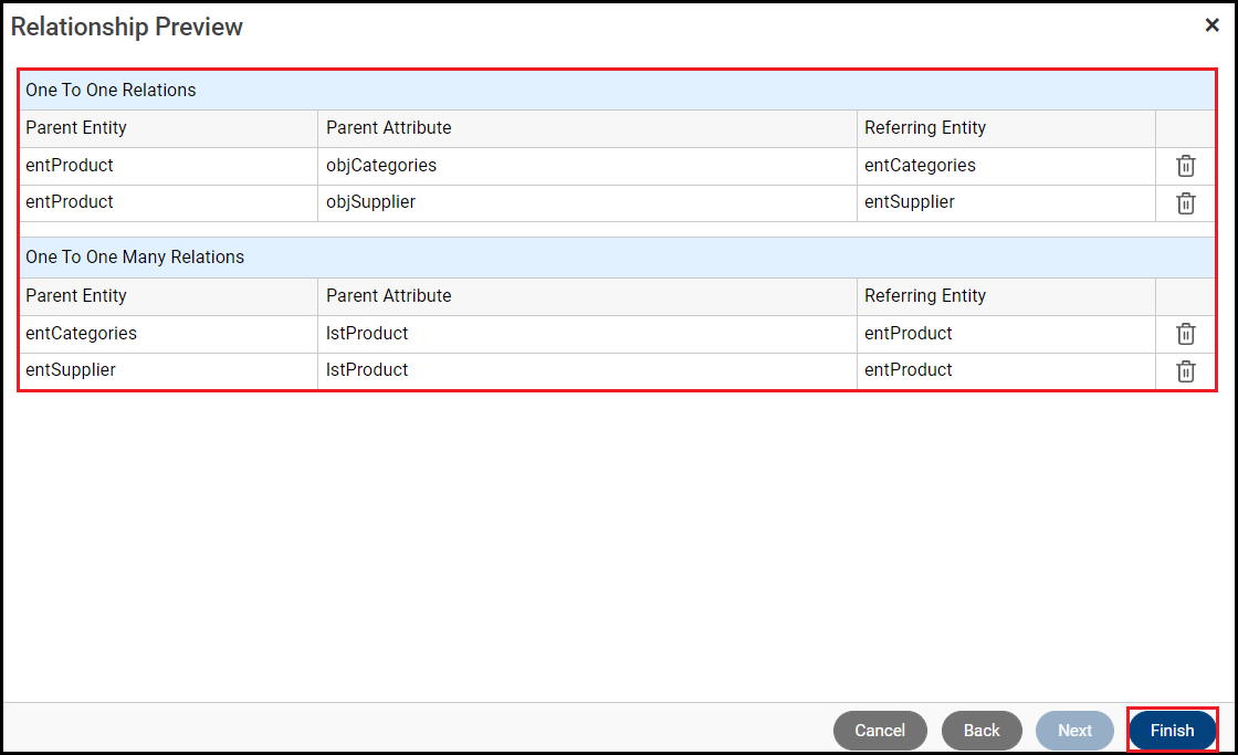 Xelence will populate the one to one and one to many relationships it expects. You can remove relationships, if desired. If an entity has a one to one relationship, it is a child of that entity. For example, an order can only have one customer.