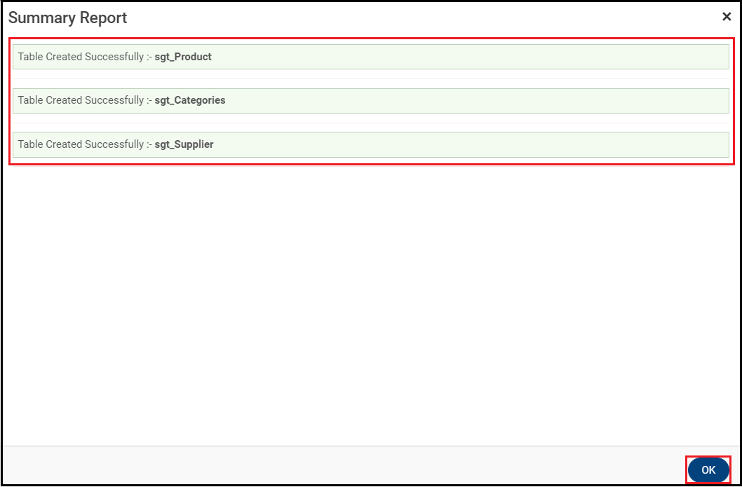 Xelence displays a summary of the tables it created. Close the popup and begin working with the entities. Xelence creates an entity for each selected tabsheet and a database table for each entity. For each table, it inserts the data from the respective tabsheet.