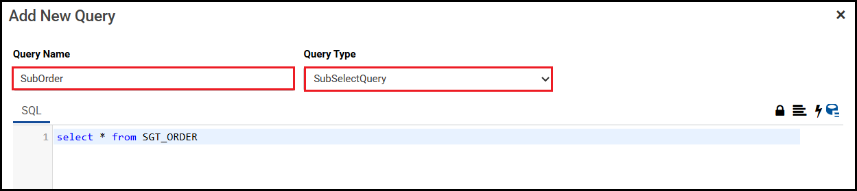 Name your new query. Choose the Query Type. All sub queries are SubSelectQuery type.