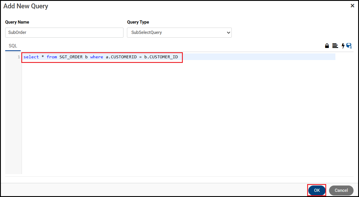 Give the tables aliases to make queries easier to manage. In this example, sgt_Customer is aliased as 'a' (used in the main query of the customer lookup) and sgt_Order is aliased as 'b' (used in sub query of the customer lookup).
