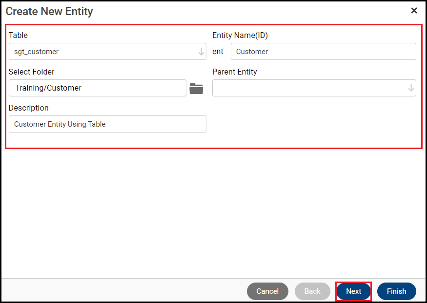 - Select Folder: Specifies the location for the entity. You can either choose an existing folder or create a new one.