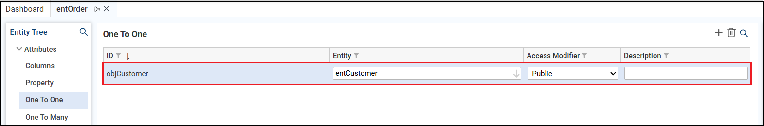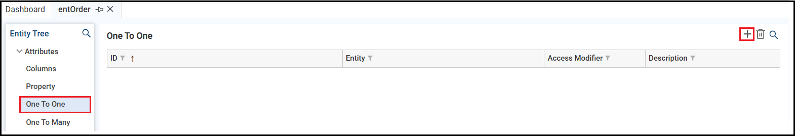 This is where the entity manages its one to one relationships. Click the + icon to add a relationship.