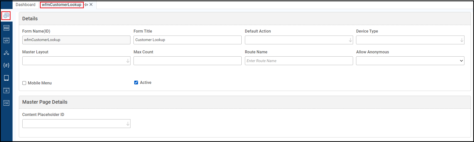 This process is identical. However, additional configuration options are added like content placeholder ID for master page details, device type, default button and route name.