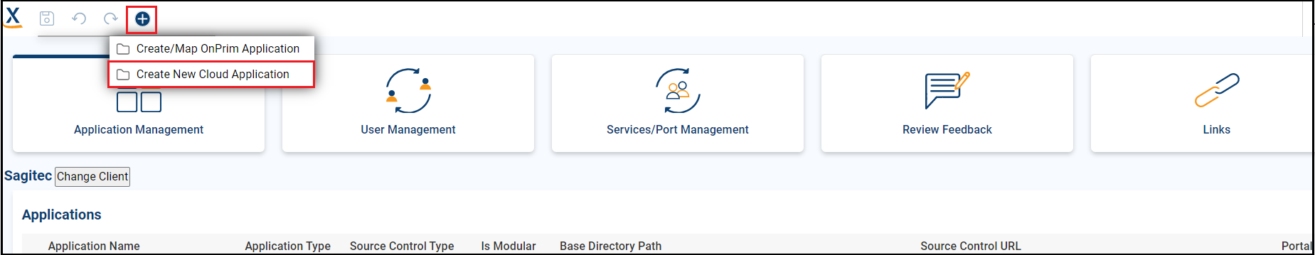 Click the Create New Application icon, then select the application type |