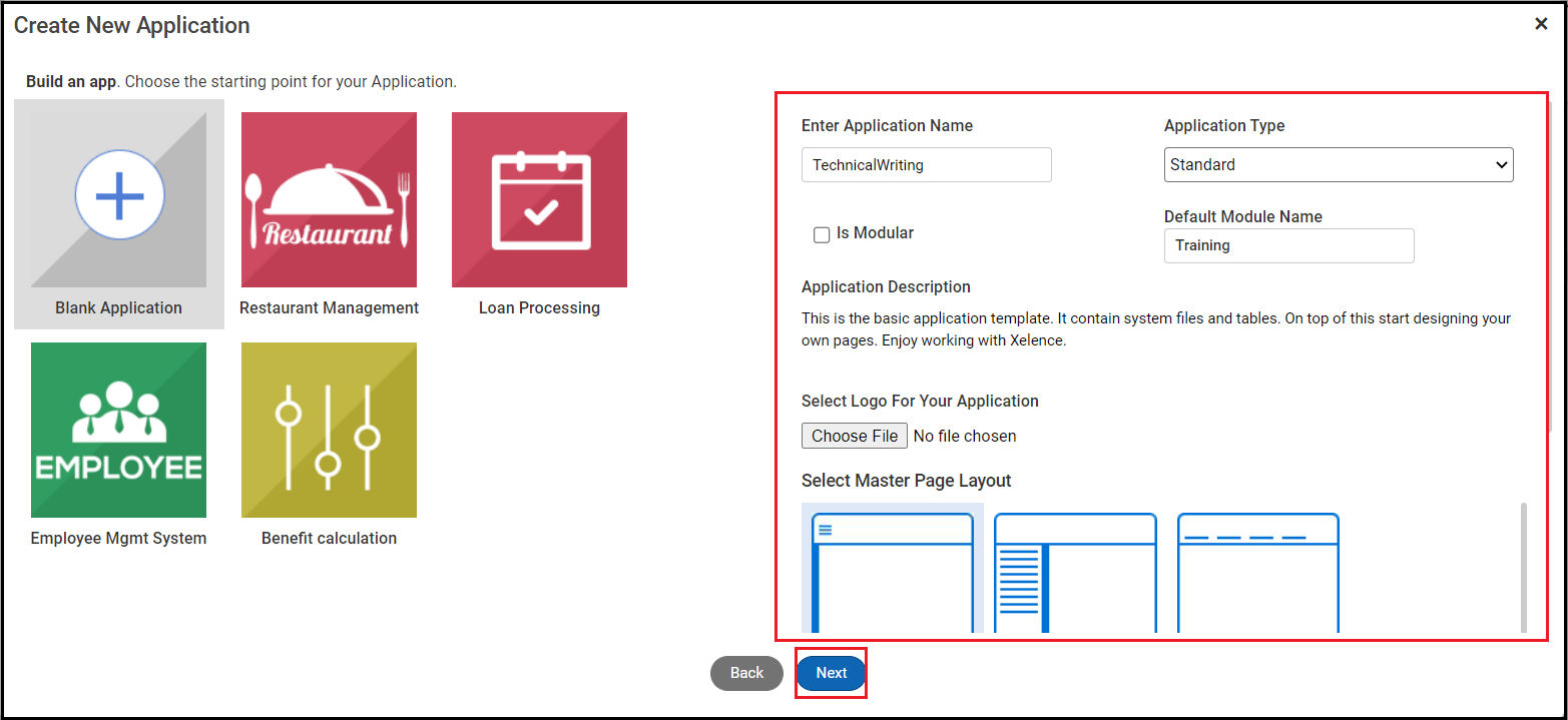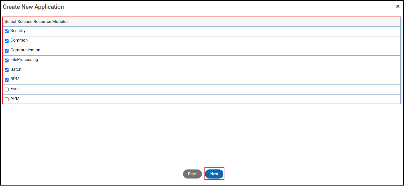 - Default Module Name: Enter the name of the default module. This will be created automatically once Xelence creates the application. This displays only if you create a non-modular application.