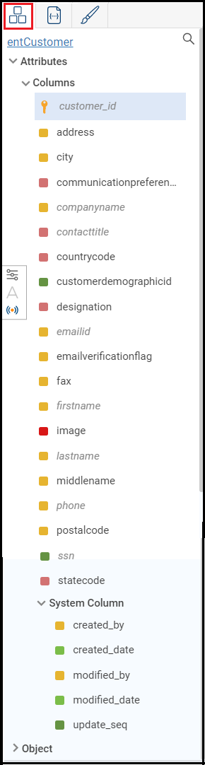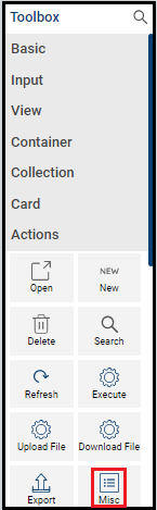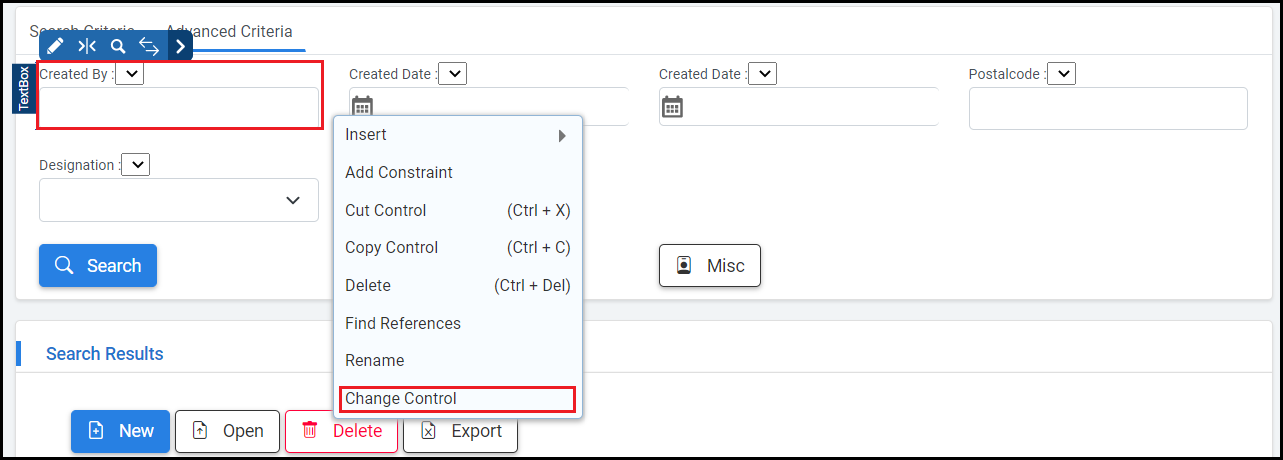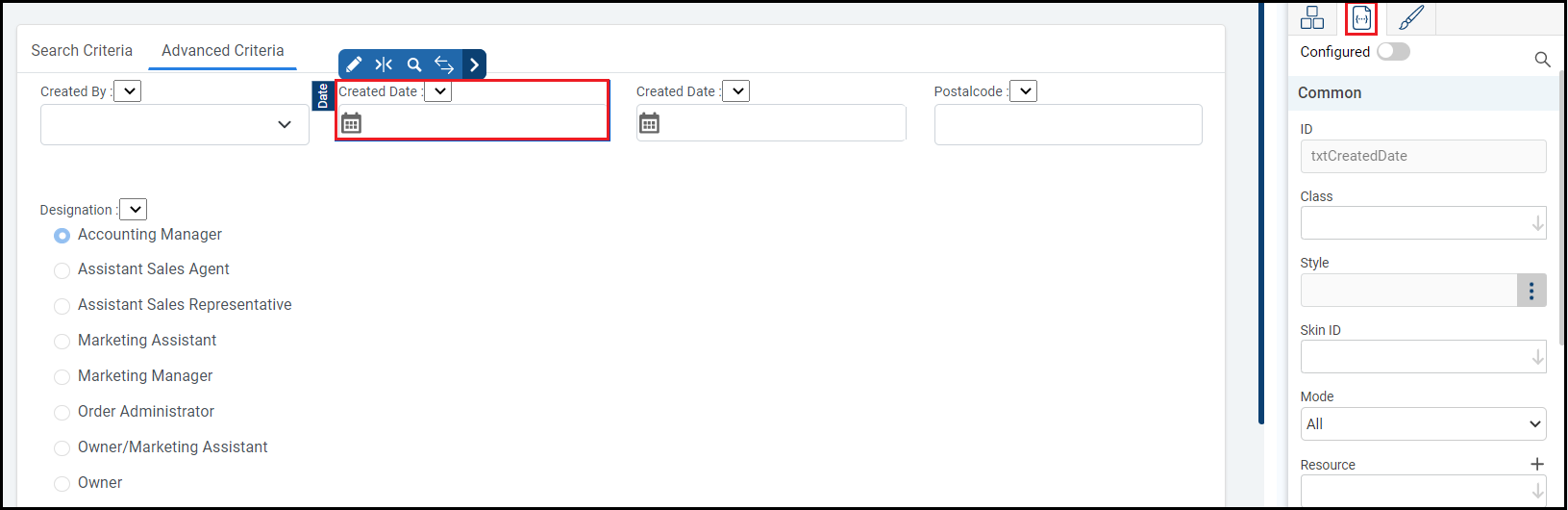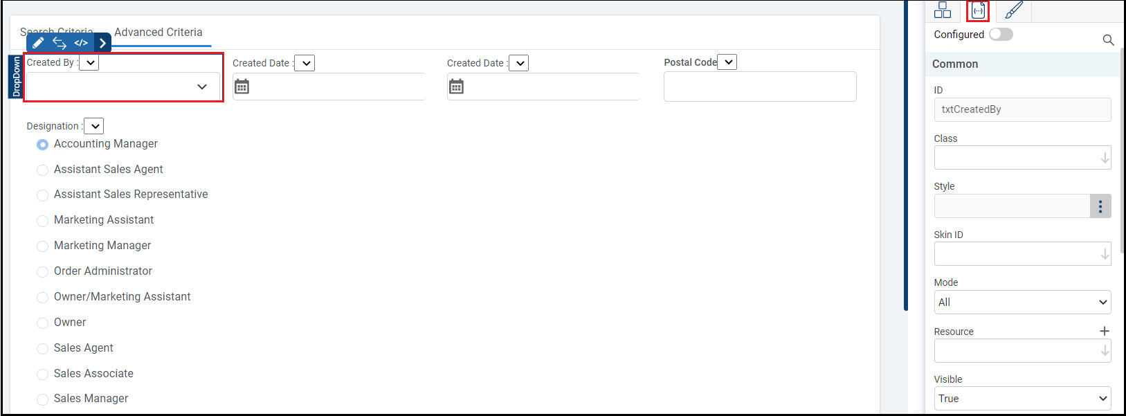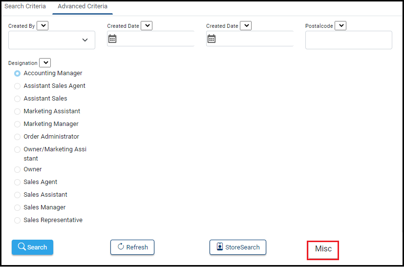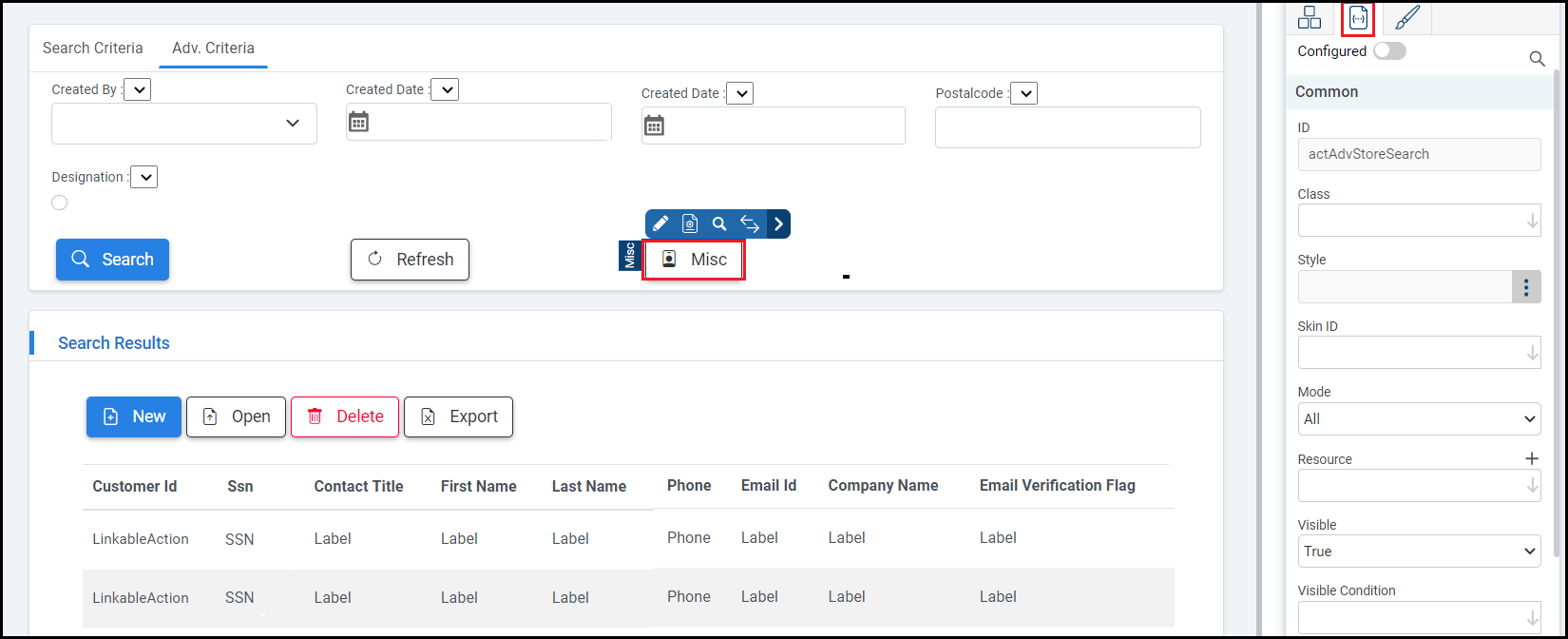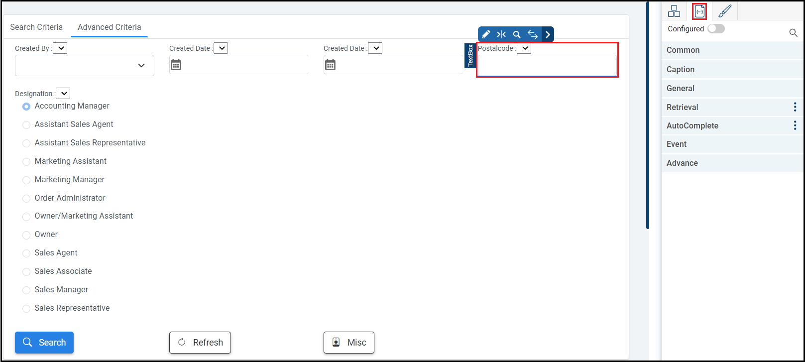 This example configures the Misc button, Postalcode field, Created By field, and Created Dates field. Open the Misc button properties.