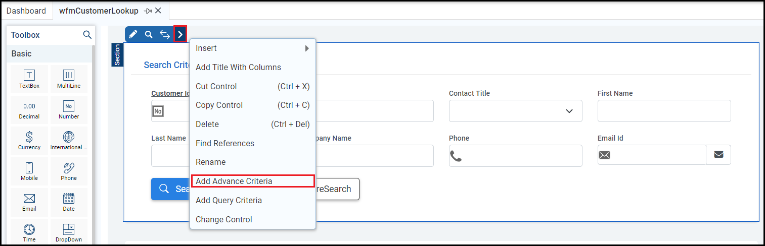 To add the Advanced Criteria tab, right click the Criteria section, click the More icon, and select Add Advance Criteria.