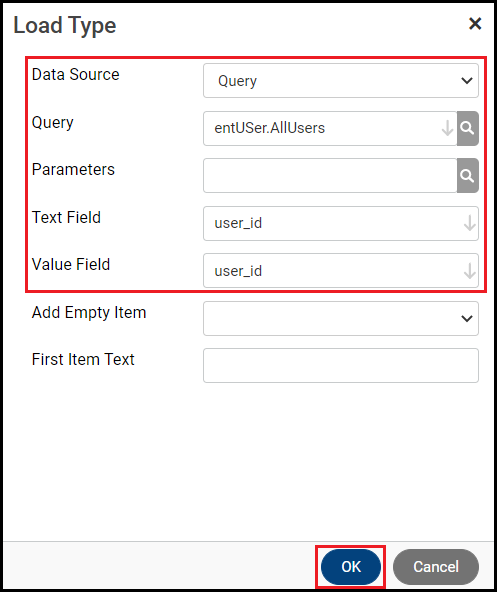 Update the Data Source to Query. This query comes from the User entity and must exist there before it can be used here.