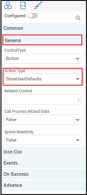 Open the General section and enter the Action Type as Store User Defaults. Update the caption so the user knows what the button does.