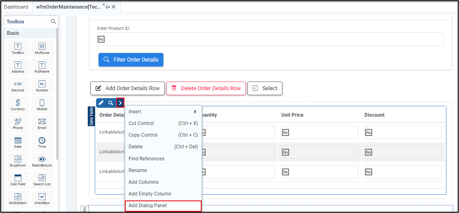 Xelence adds a fully configured dialog panel to the data table. You can also add more controls from the Entity tab the same way you'd add controls to any container. The buttons are automatically configured with the Related Control property.