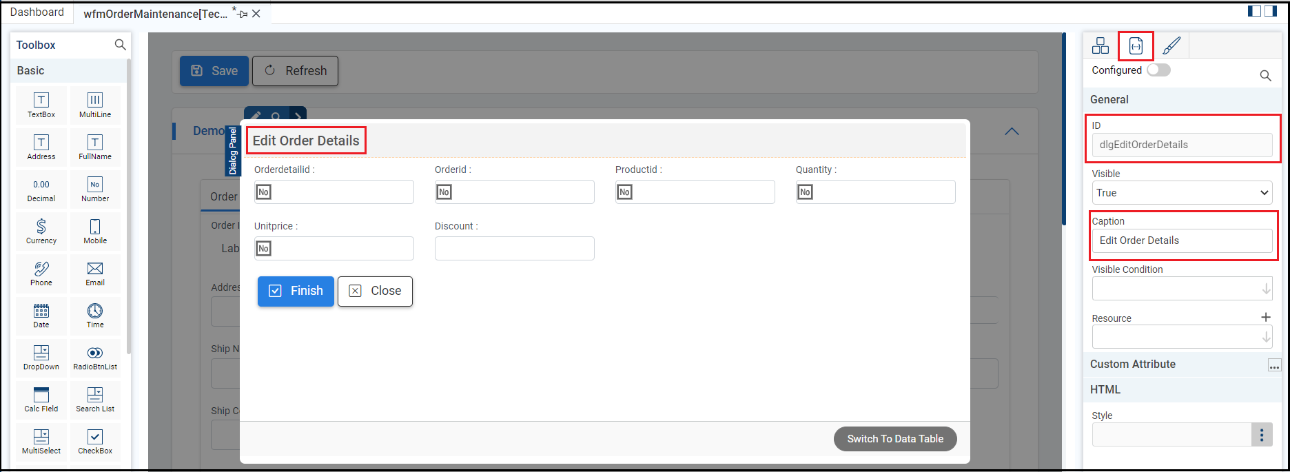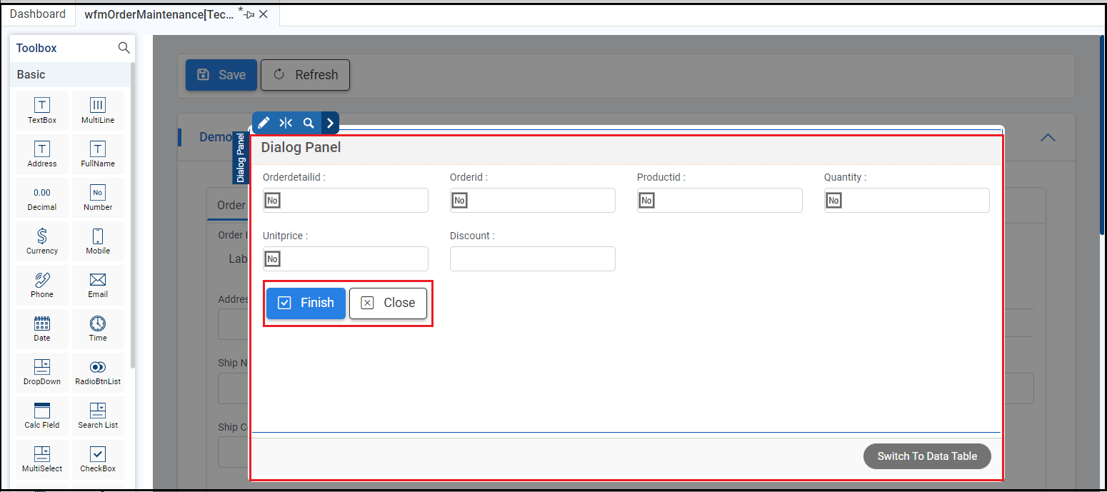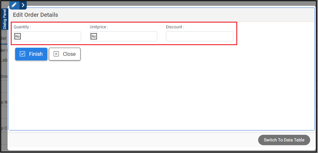 Earlier, we used to get an empty dialog panel. Now, when we add a dialog panel, we get a configured dialog panel with most of the fields (which are present in the data table) and buttons (Finish popup dialog button, Close popup dialog button, new and open button) added.
