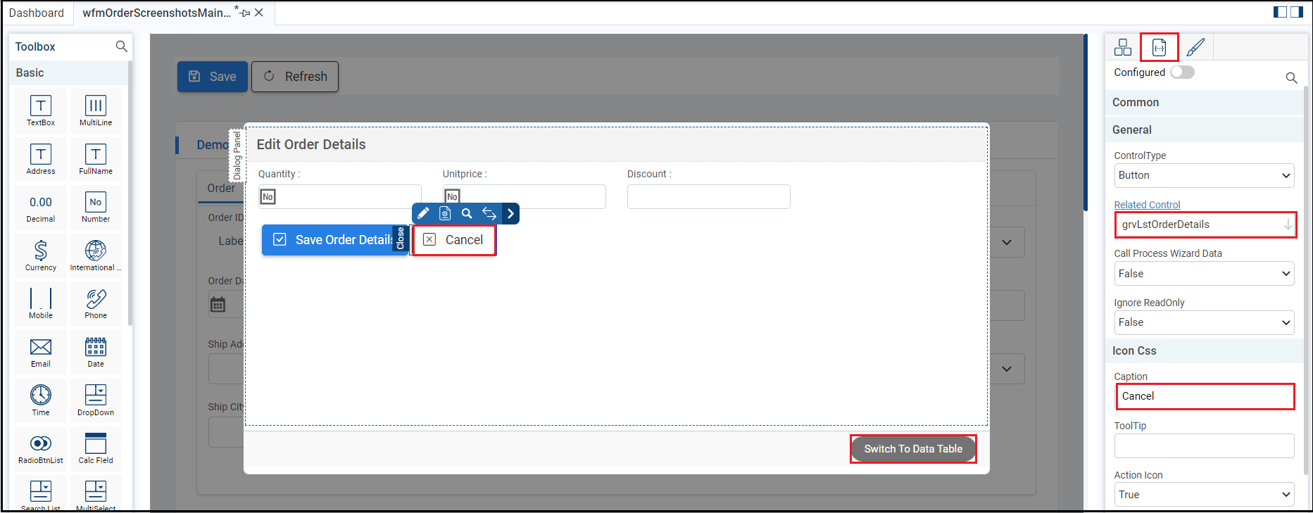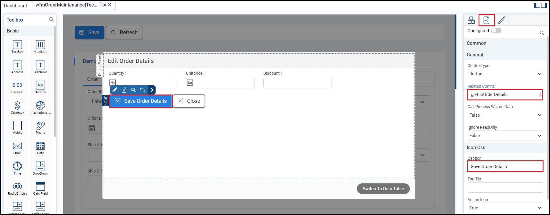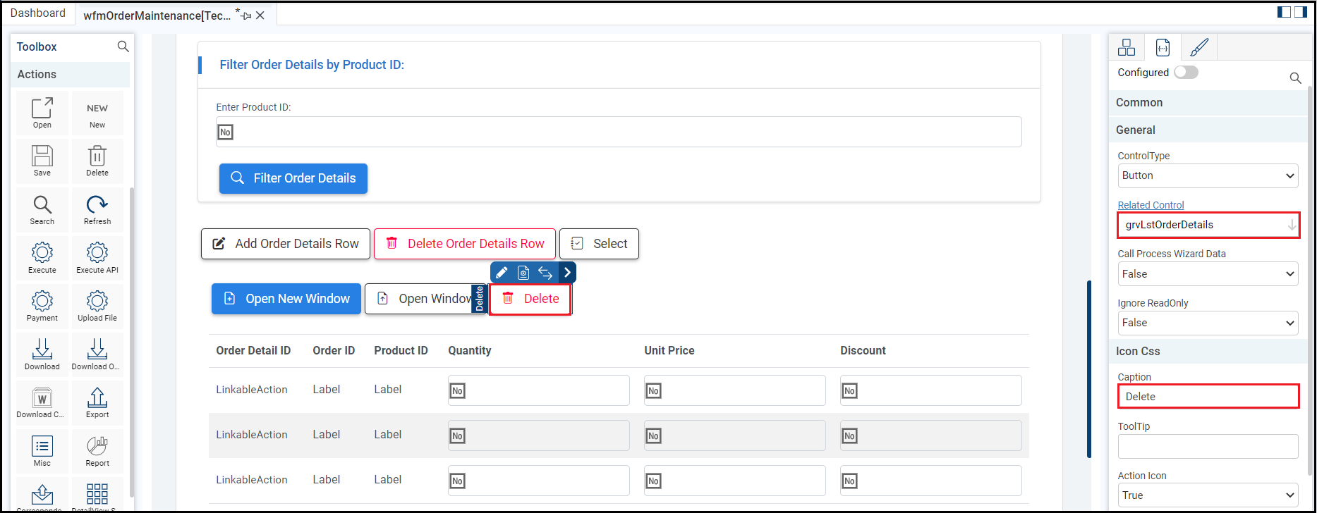 Also, for this button to function properly, make sure delete order is configured on the entity. In this case, that's entOrderDetails.