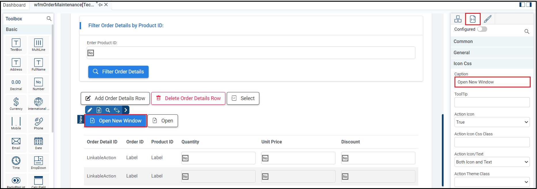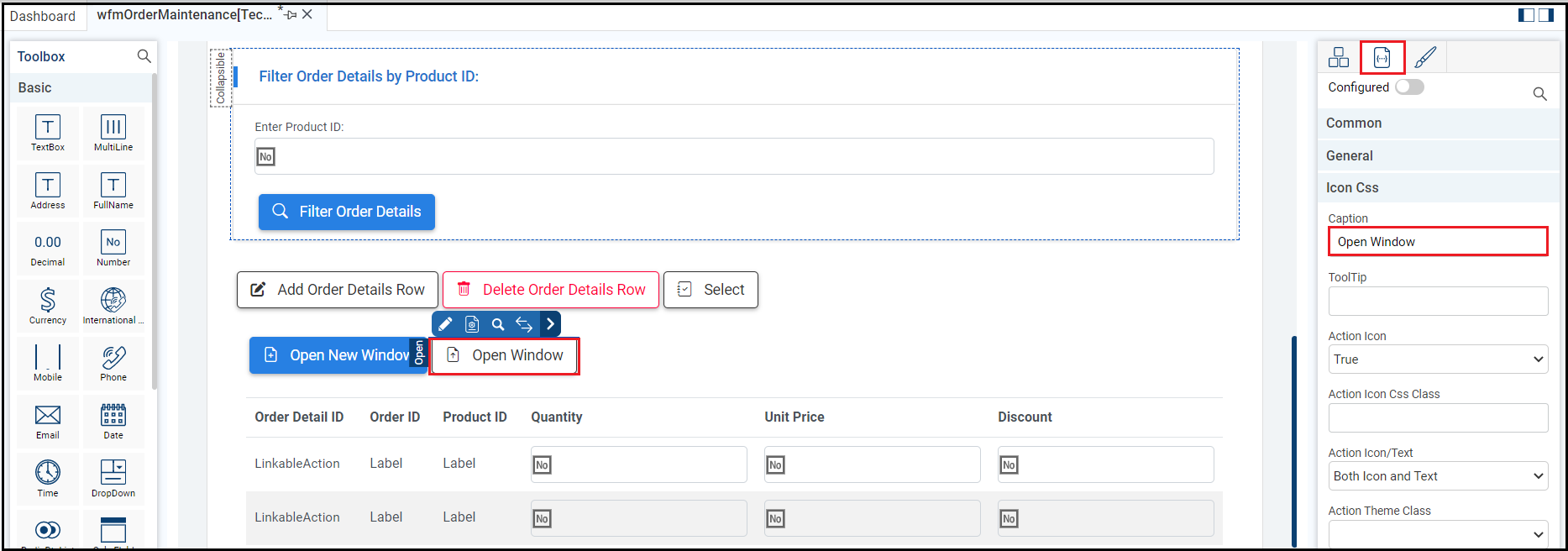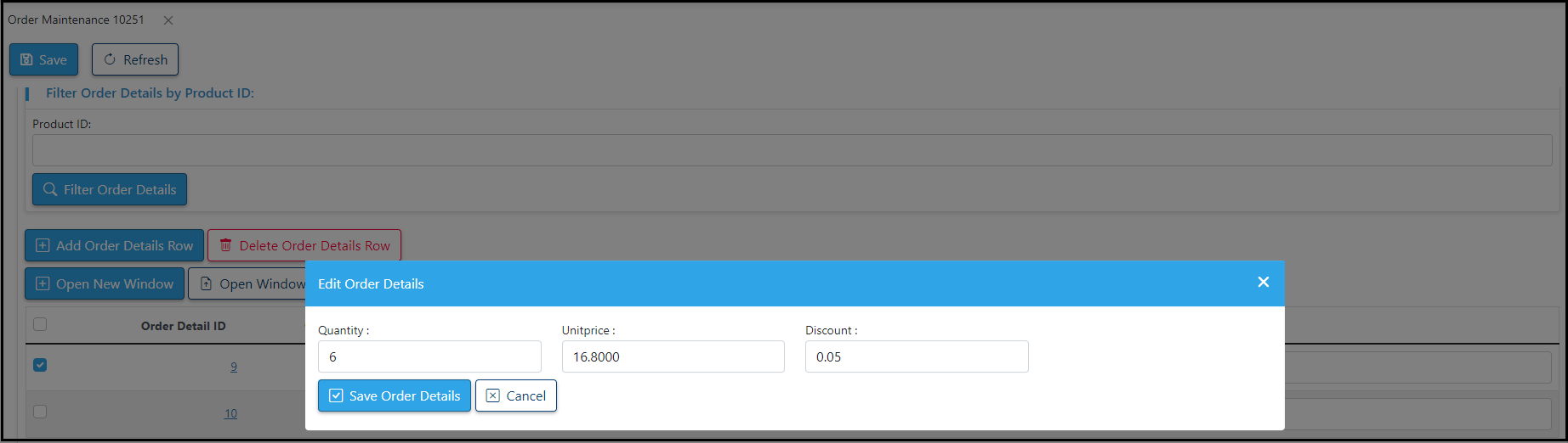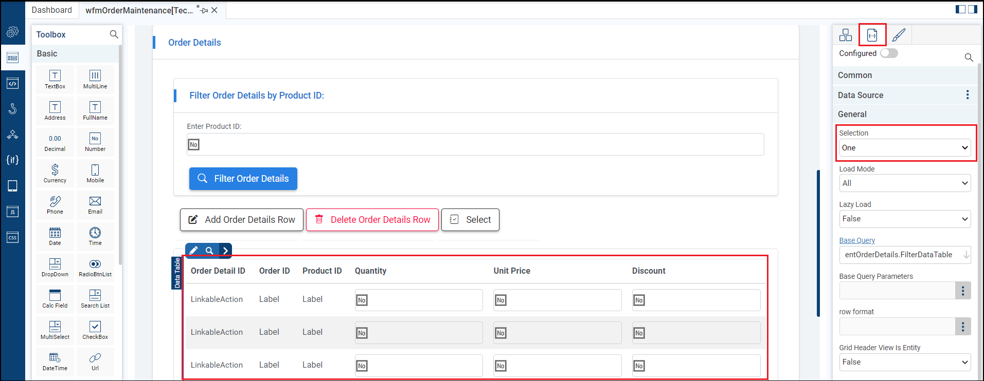 Also, for this button to function properly, make sure delete order is configured on the entity. In this case, that's entOrderDetails.