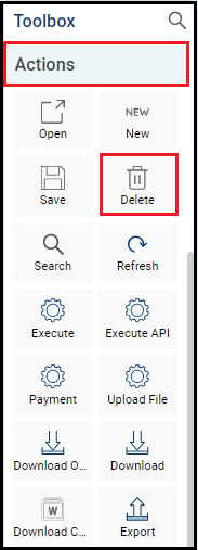 Drag the Delete icon from the Toolbox tab to the right of the Open button. This button deletes selected rows from the data table.