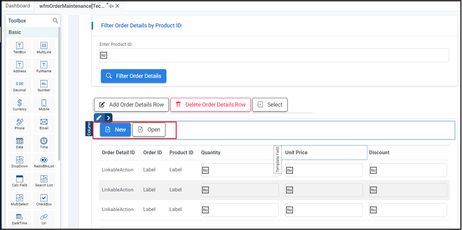 The New and Open buttons are automatically configured with the Related Control and Open in Dialog properties.
