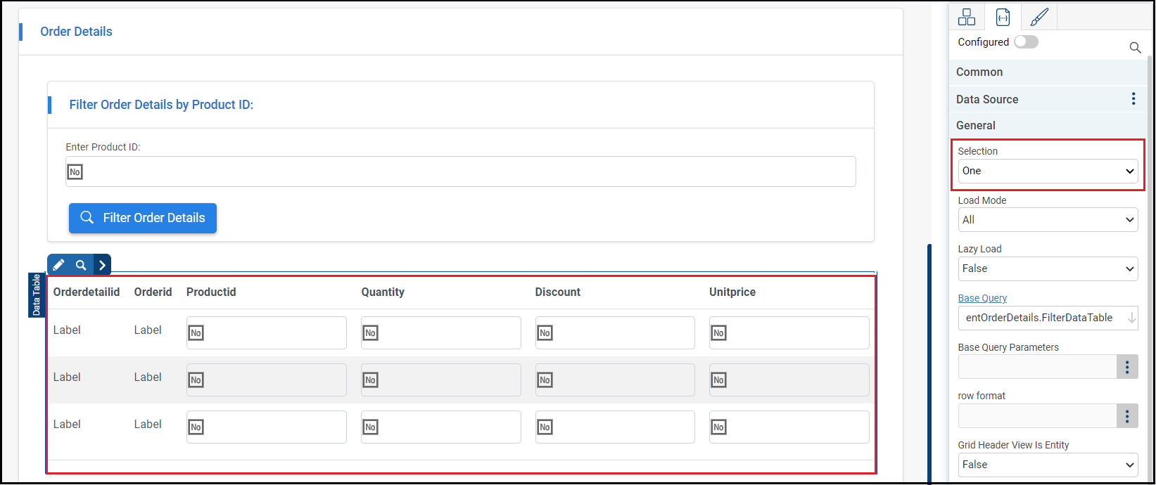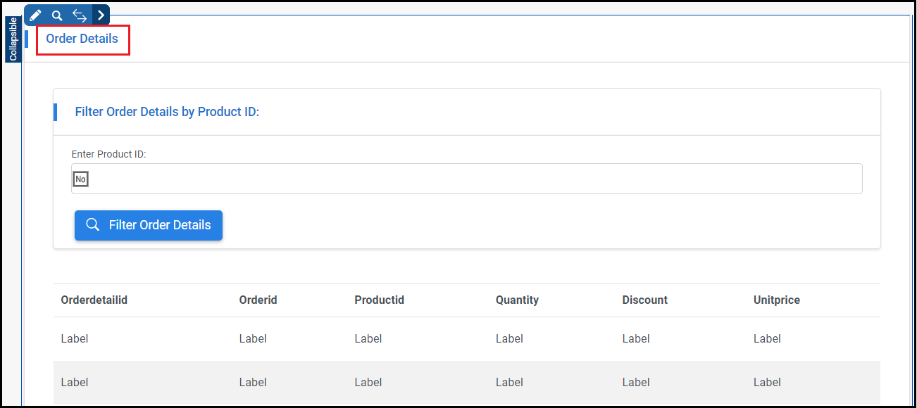 Select the collapsible control whose data table you want to enable editing. This example selects the Order Details collapsible control.