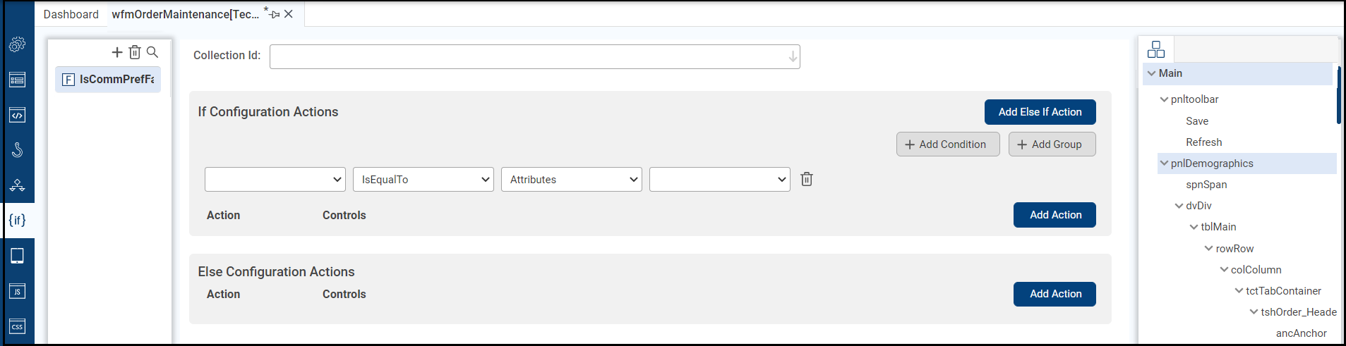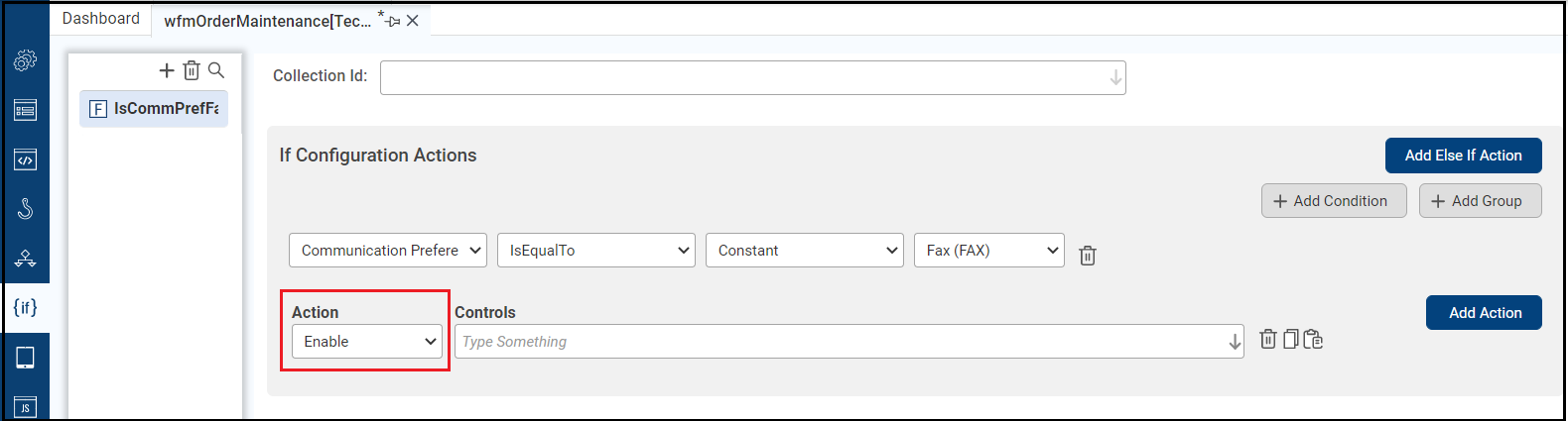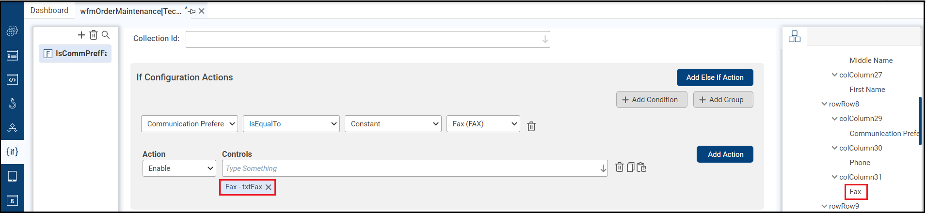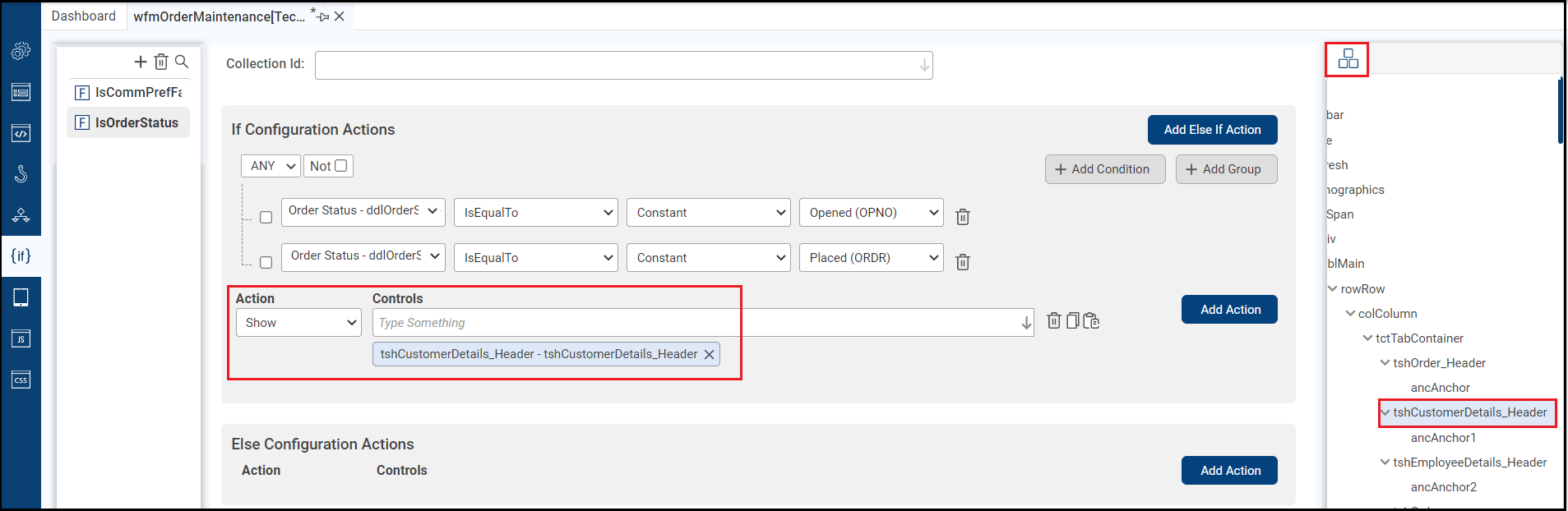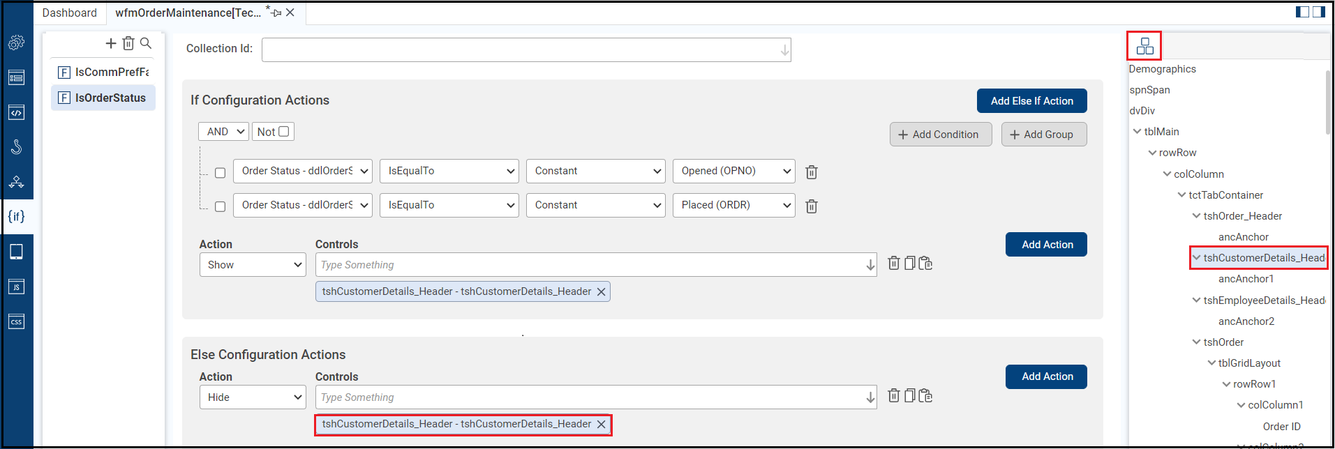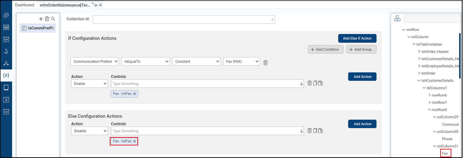 Previously, the options client enable and visible were available in the properties section of the control. Now, the configurations for this functionality can be done using the conditions and actions tab available in the form. Also, to this, multiple group conditions and actions can be added with not/and/any operators.
