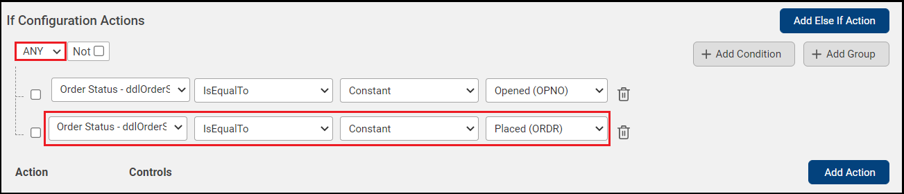Add another record for when Order Status is Ordered. This forms a group. For either of the conditions to be true (Order Status as Opened or Order Status as Ordered), make sure you select the ANY condition from the drop down. You can also add multiple records at once by clicking the Group button.