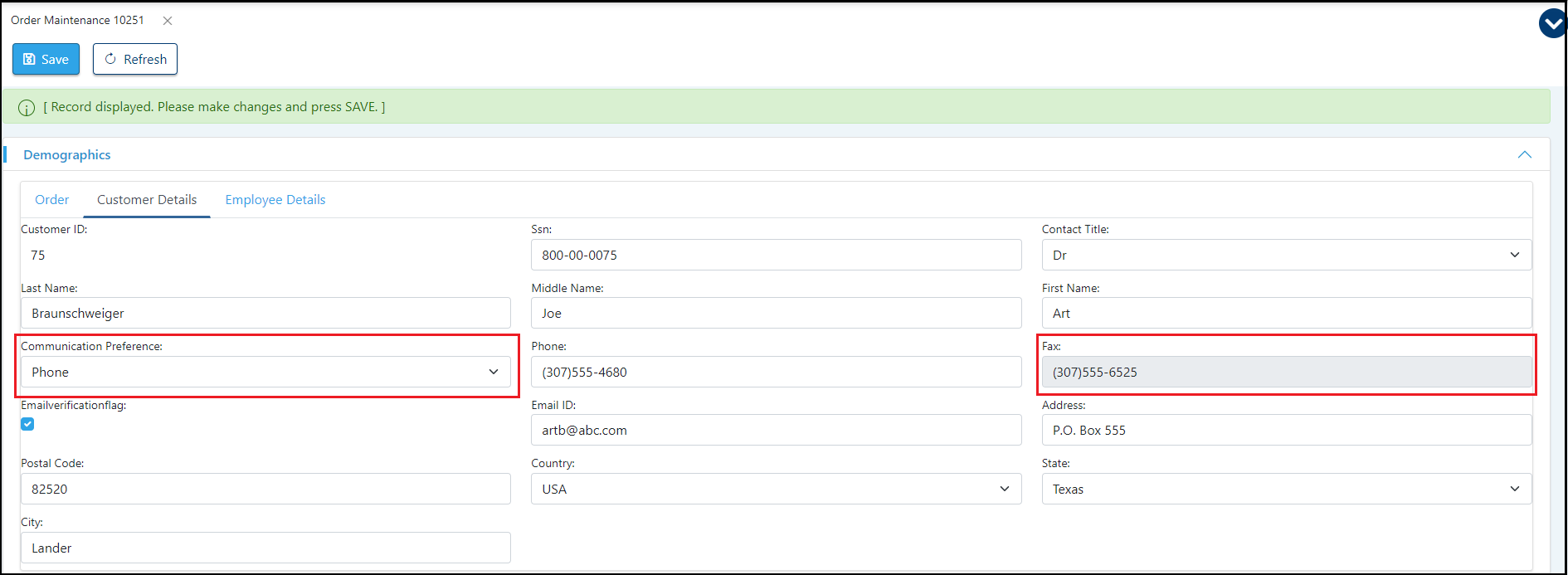 In this example, Communication Preference is not Fax, so the Fax field is disabled.