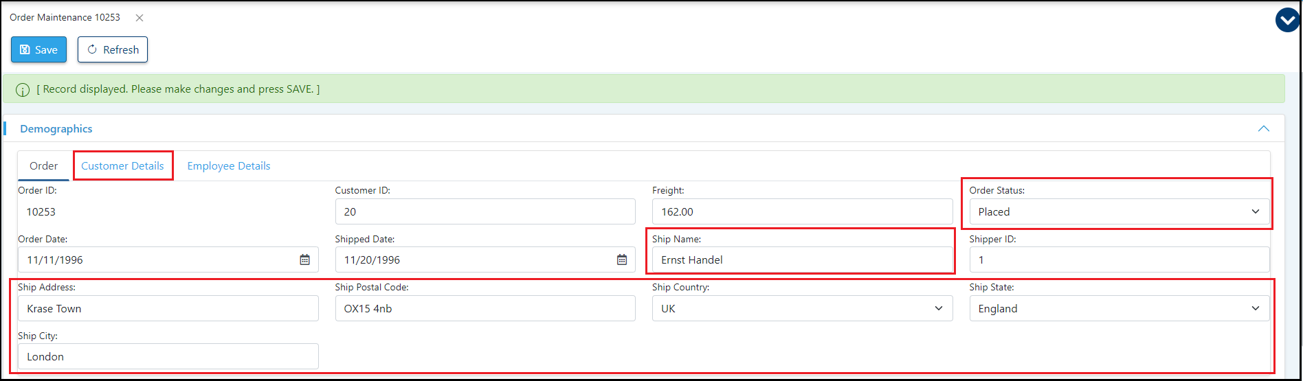 Order Status is placed (ORDR) and Ship Name is entered, so the Customer Details tab is visible and the Shipper ID, Ship Address, Ship Postal Code, Ship Country, Ship State, and Ship City fields are also visible.