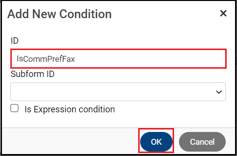 This example's condition is "Communication Preference equals FAX" means the user cannot enter the Fax unless their Communication Preference is Fax.