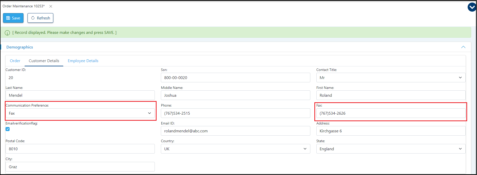 In this example, Communication Preference is Fax, so the Fax field is enabled.