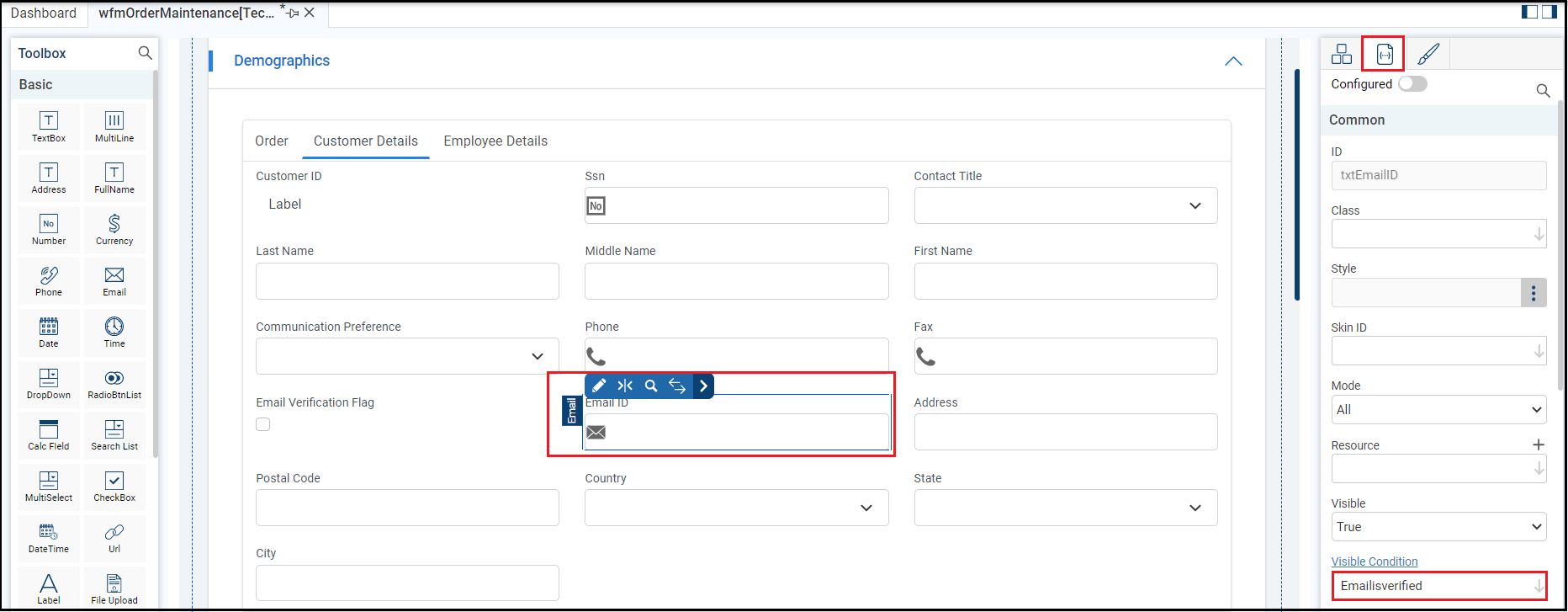Open the form with the control you want to configure. Here, it is wfmOrderMaintenance form.