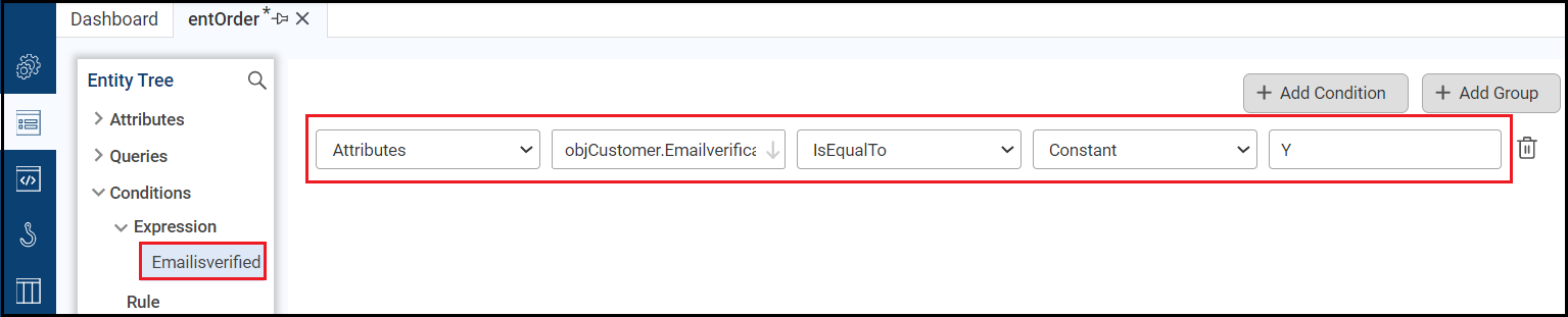 - Condition: Inserts another condition in your expression as long as it's part of the same entity.