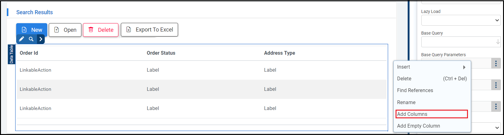 To add the columns in the data table, right click the data table and click Add columns. Xelence displays the Add Column wizard. Complete the wizard and click OK.