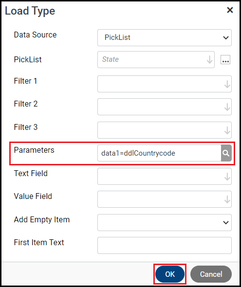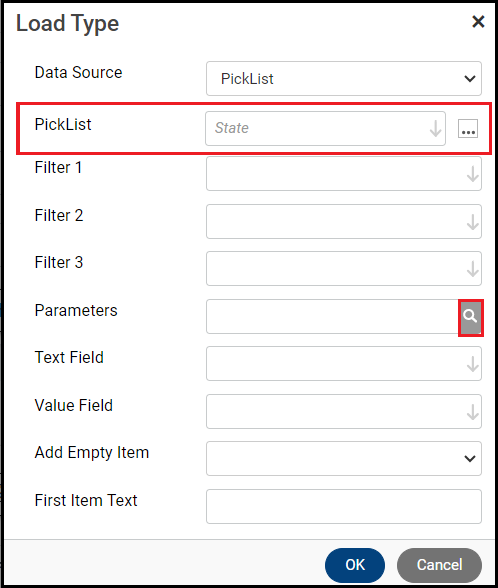 For the child drop down, after entering the Picklist, click the magnifying glass icon to open and enter the parameters.