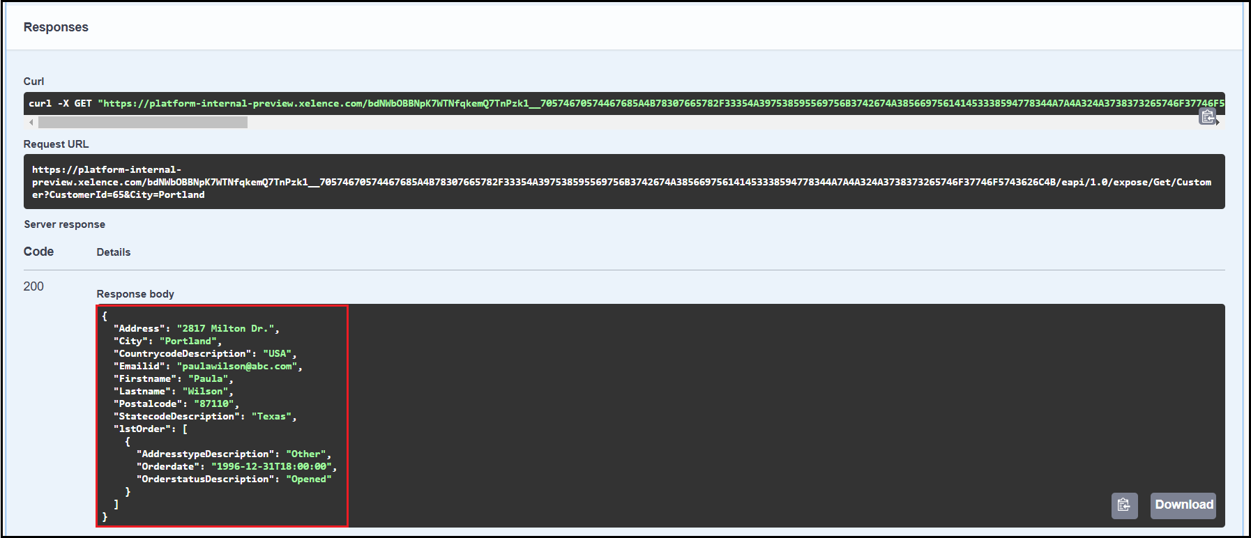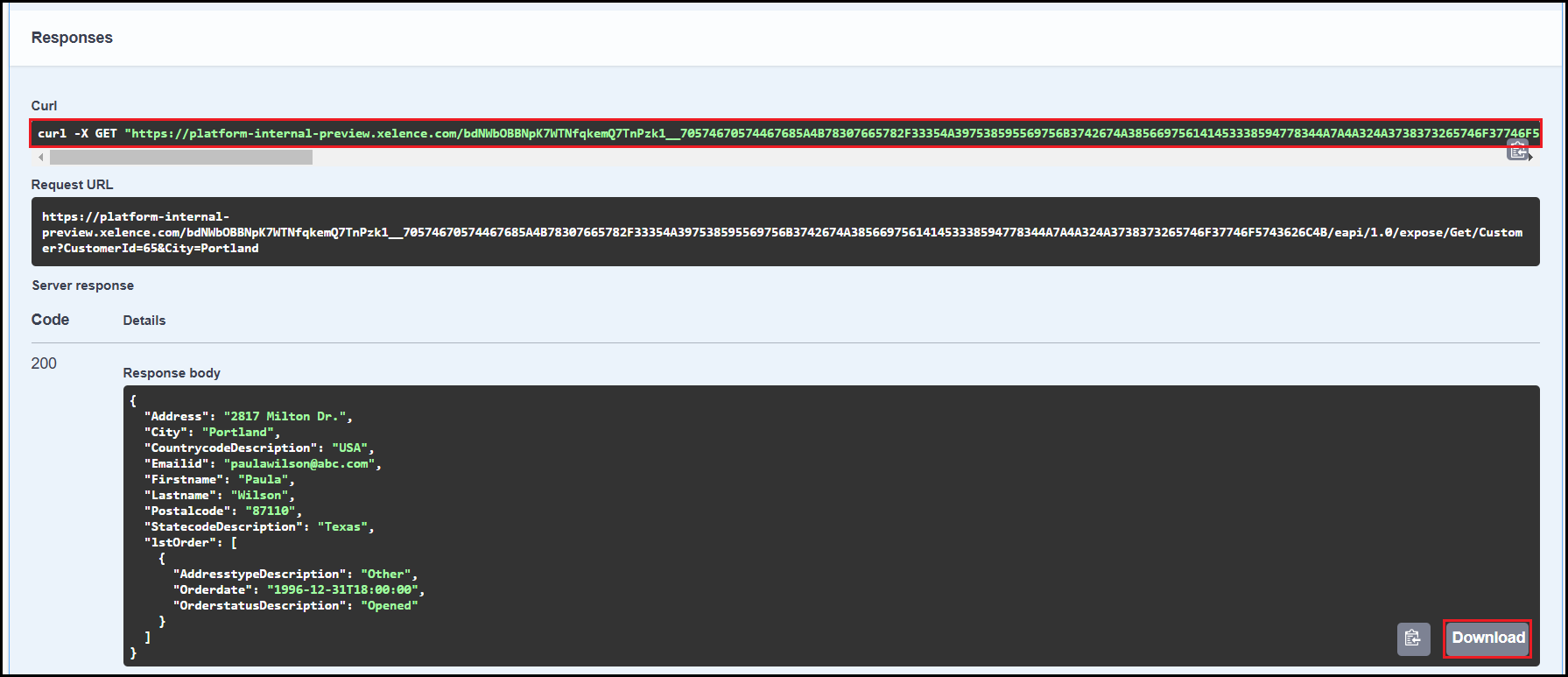 Swagger generates an API link that can be used in other applications. Click the Download button to download the API response in a JSON file.