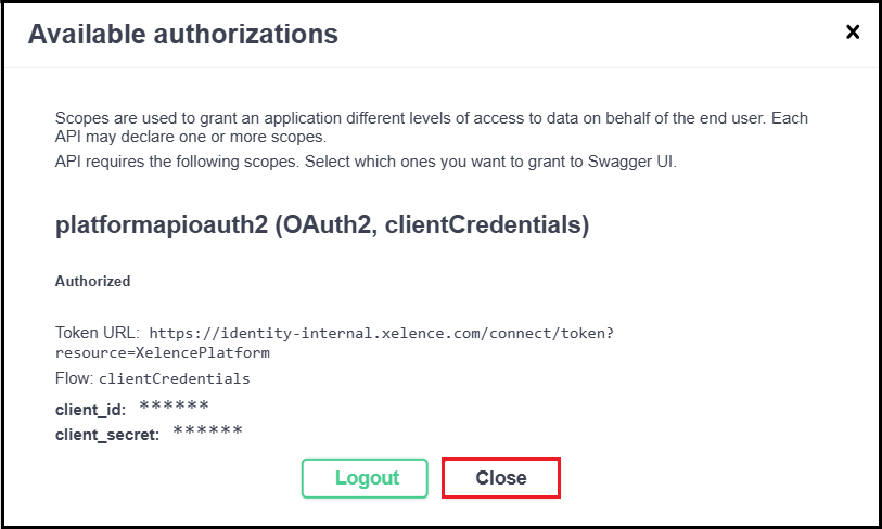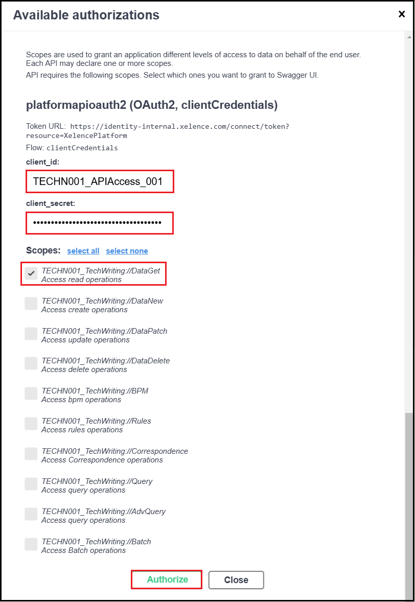 Select the desired scope depending on your data operation. In this case, select DataGet as the scope. Click the Authorize button.