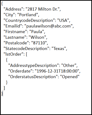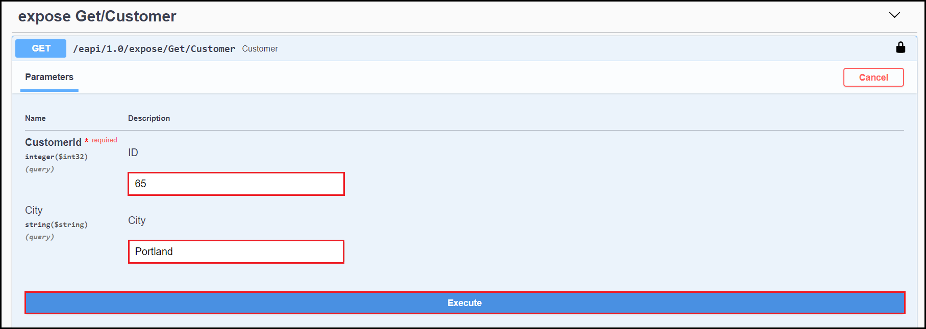 This example uses Customer ID and City as parameters. Enter “65” and “Portland” respectively.