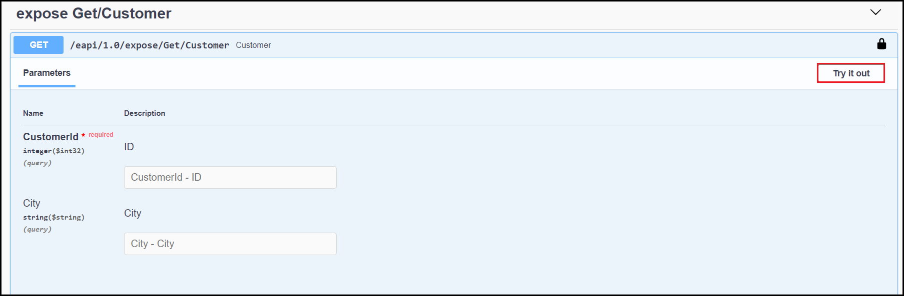 Click the Try it out button. Swagger enables entering the parameters.