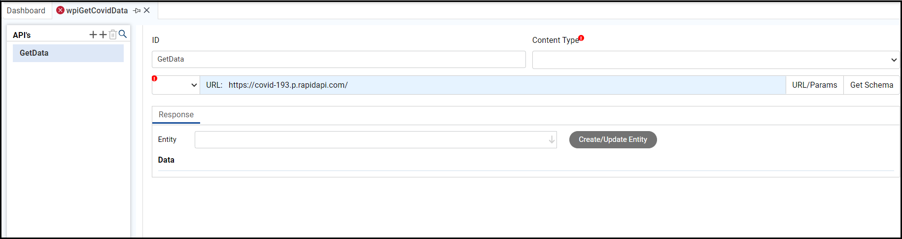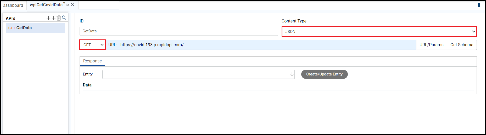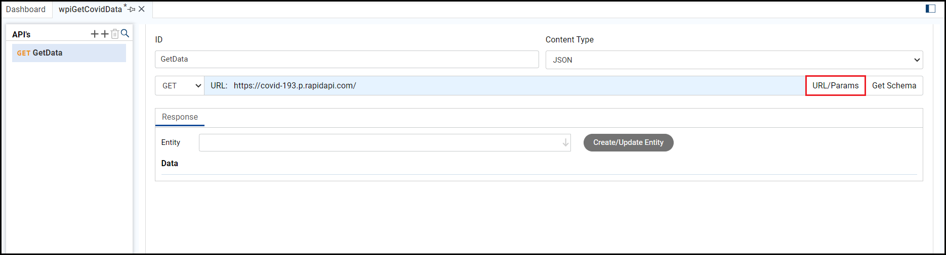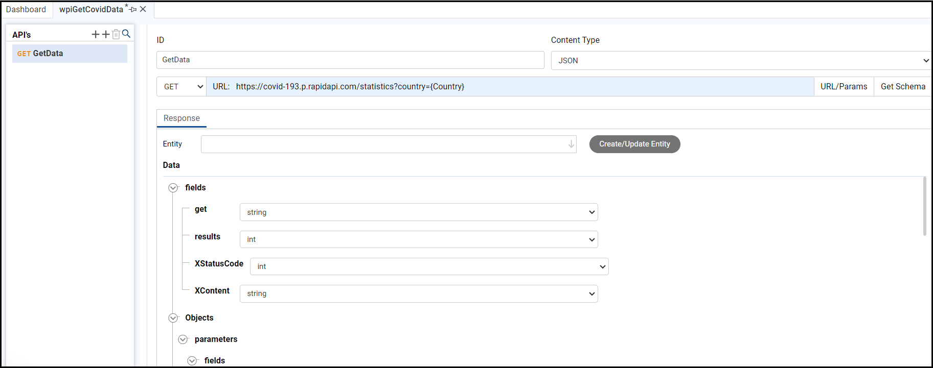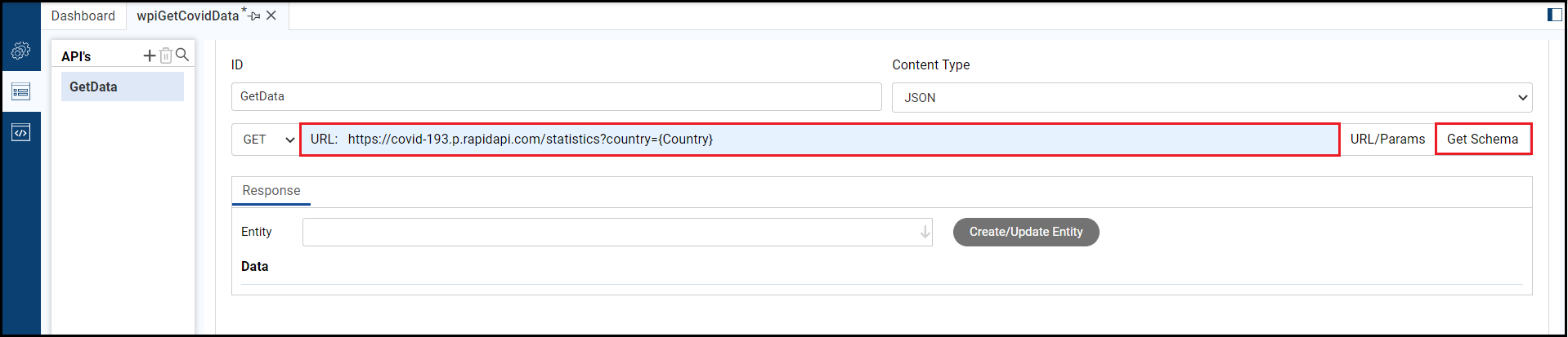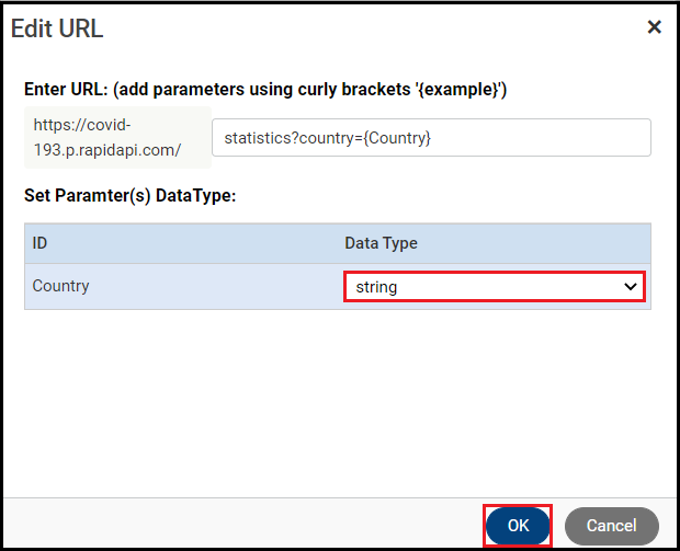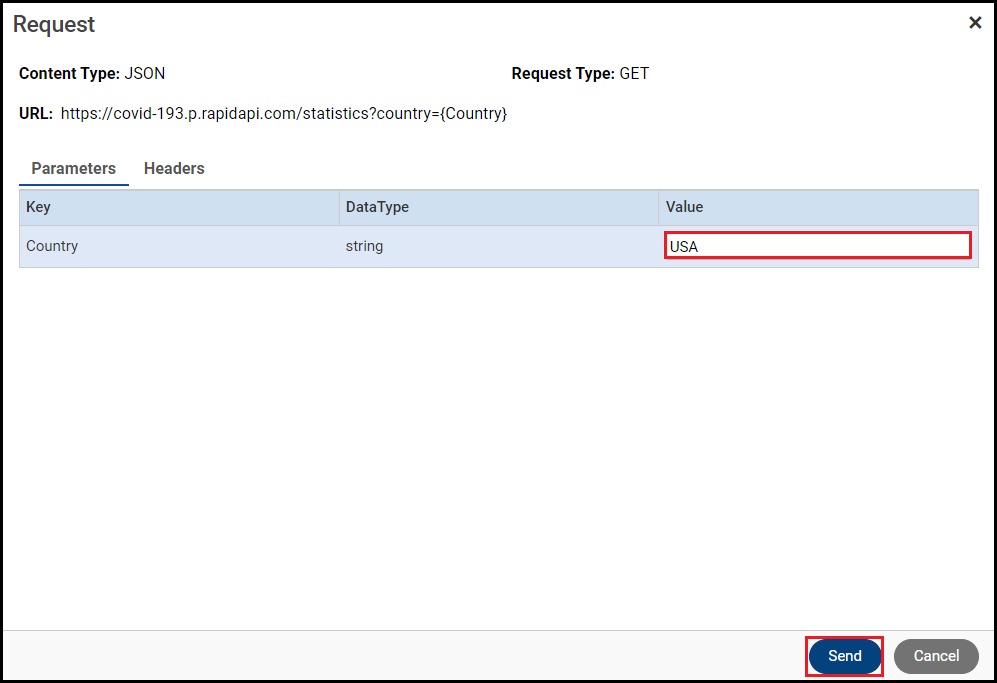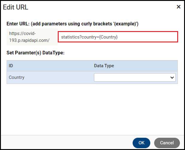 Enter the URL for the specified resource parameters you want to consume to get the data. This example uses statistics?country={Country}.