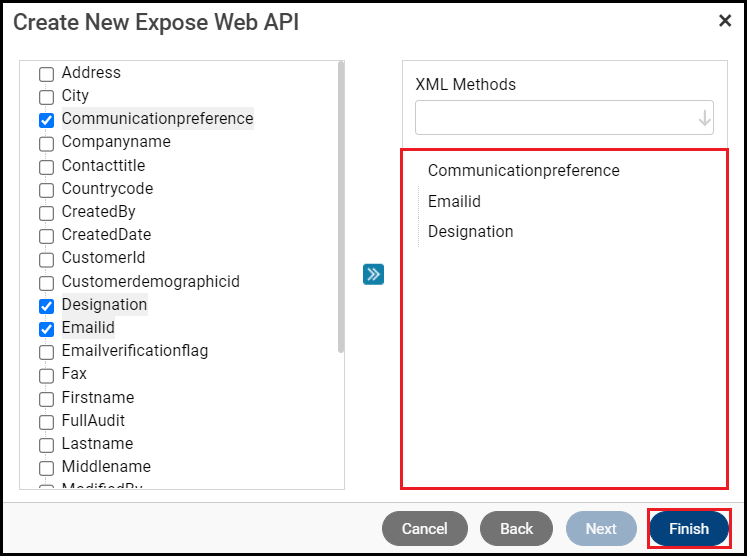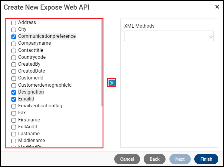 Xelence uses the entity the Web API is based on to expose the available fields. Select the fields you want and click the Add button.
