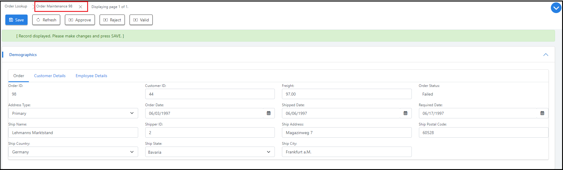 When you have previewed your form, it should look something like this. You can open a record with an Other Address Type and navigate to the Order New Maintenance screen.
