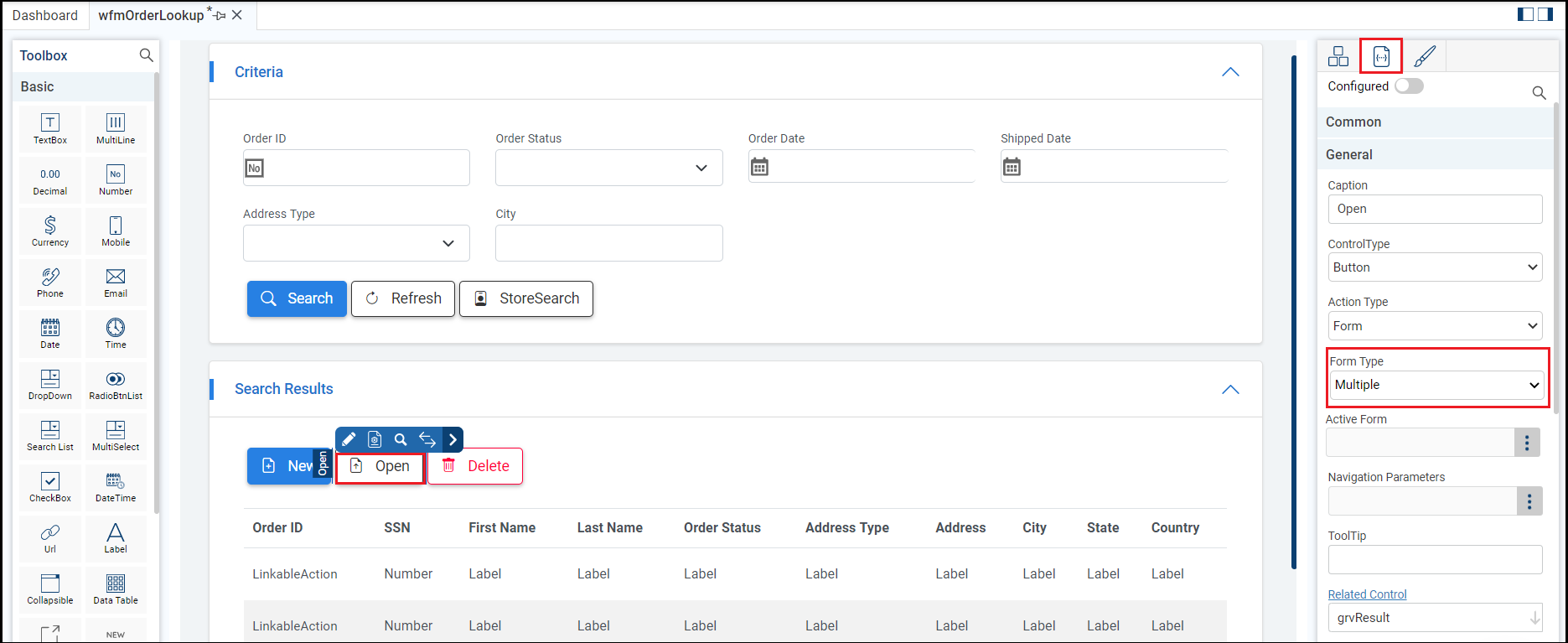 Step 4. Open the Open button properties and update the Form Type.