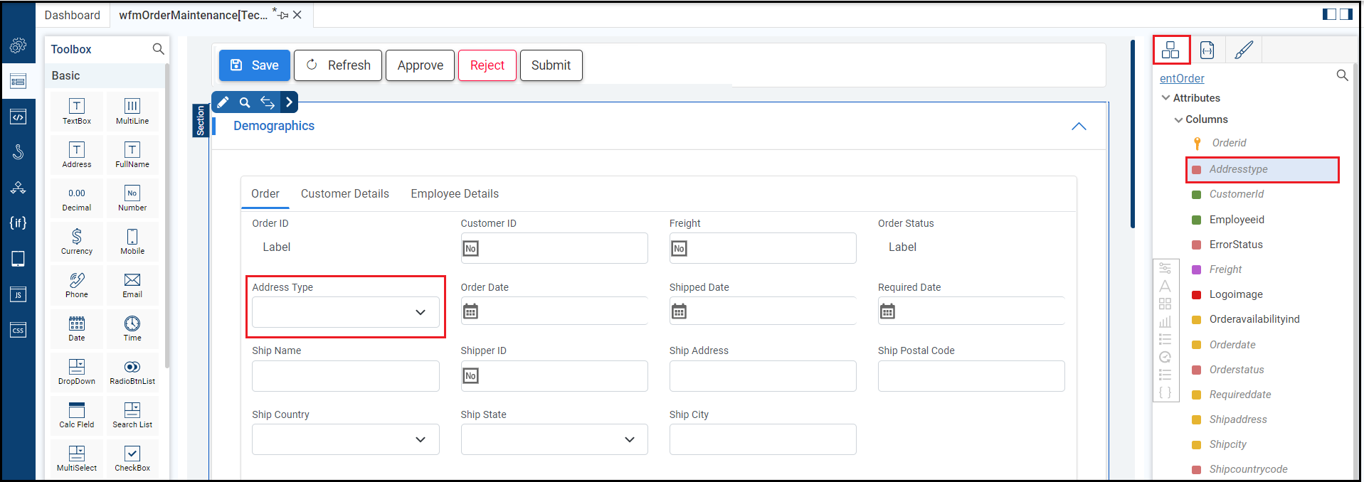 This is the form from which you will create a new form. In this case, it is wfmOrderMaintenance.