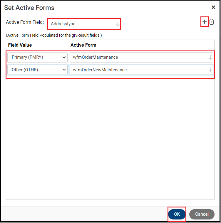 Add a row for each value and enter the form. This is the condition that will cause the application to choose that form. In this example, if Address Type is OTHR, then the application will open the maintenance form you just created, Order New Maintenance. If the value is PRMY, it will open the original Order Maintenance form.