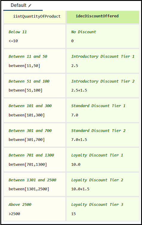 This example is a very simple decision table just to demonstrate the interface. It calculates a discount based on the number of products ordered.
