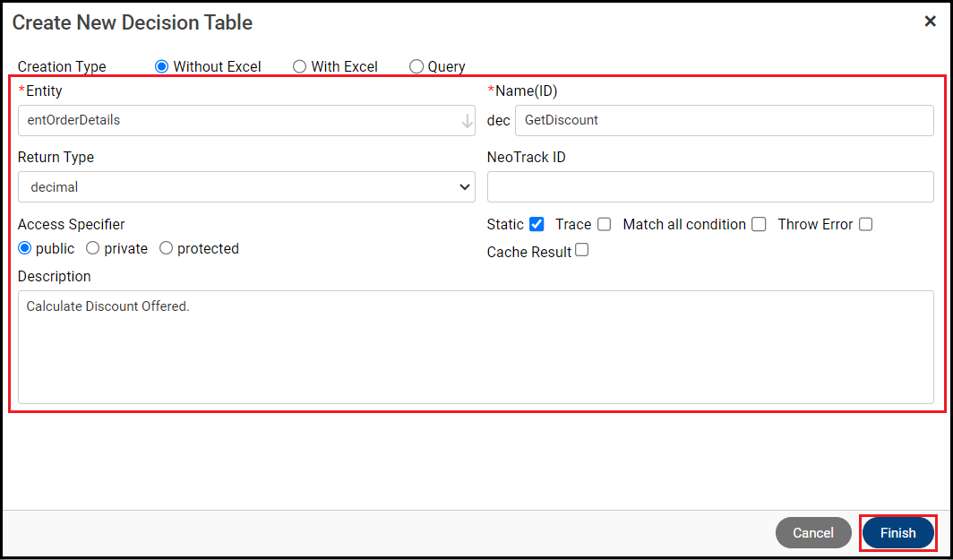 - Static: If checked, the decision table will be available to call from anywhere. Otherwise, you will have to call it from an instance of its object. In a decision table, the attributes of the entity can be directly used if it is not static.