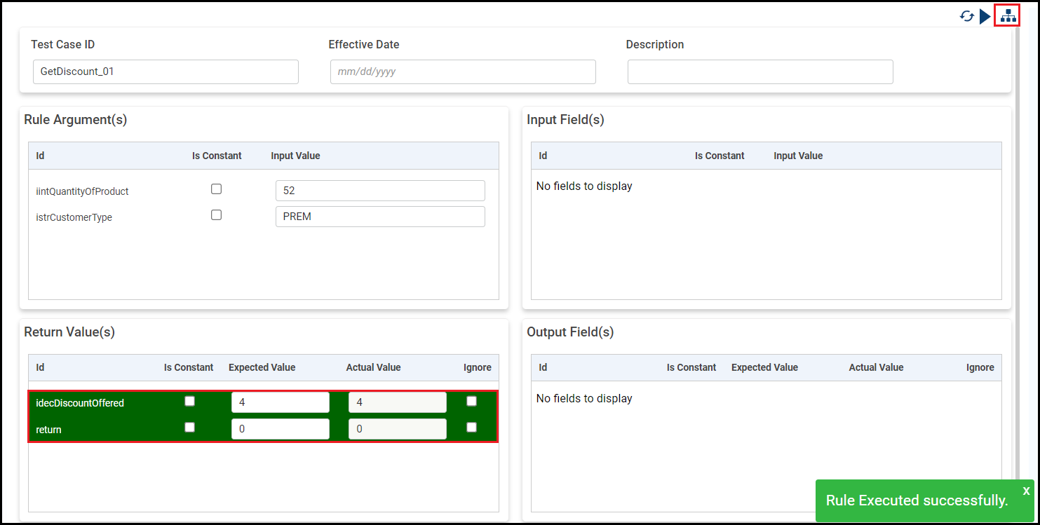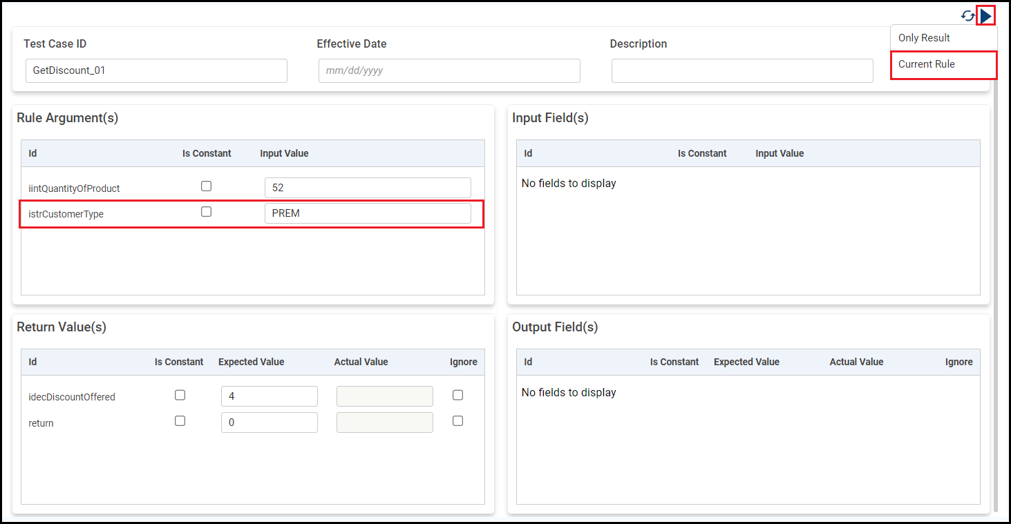 When you have entered the values, click the Run Test icon, then click Current Rule.