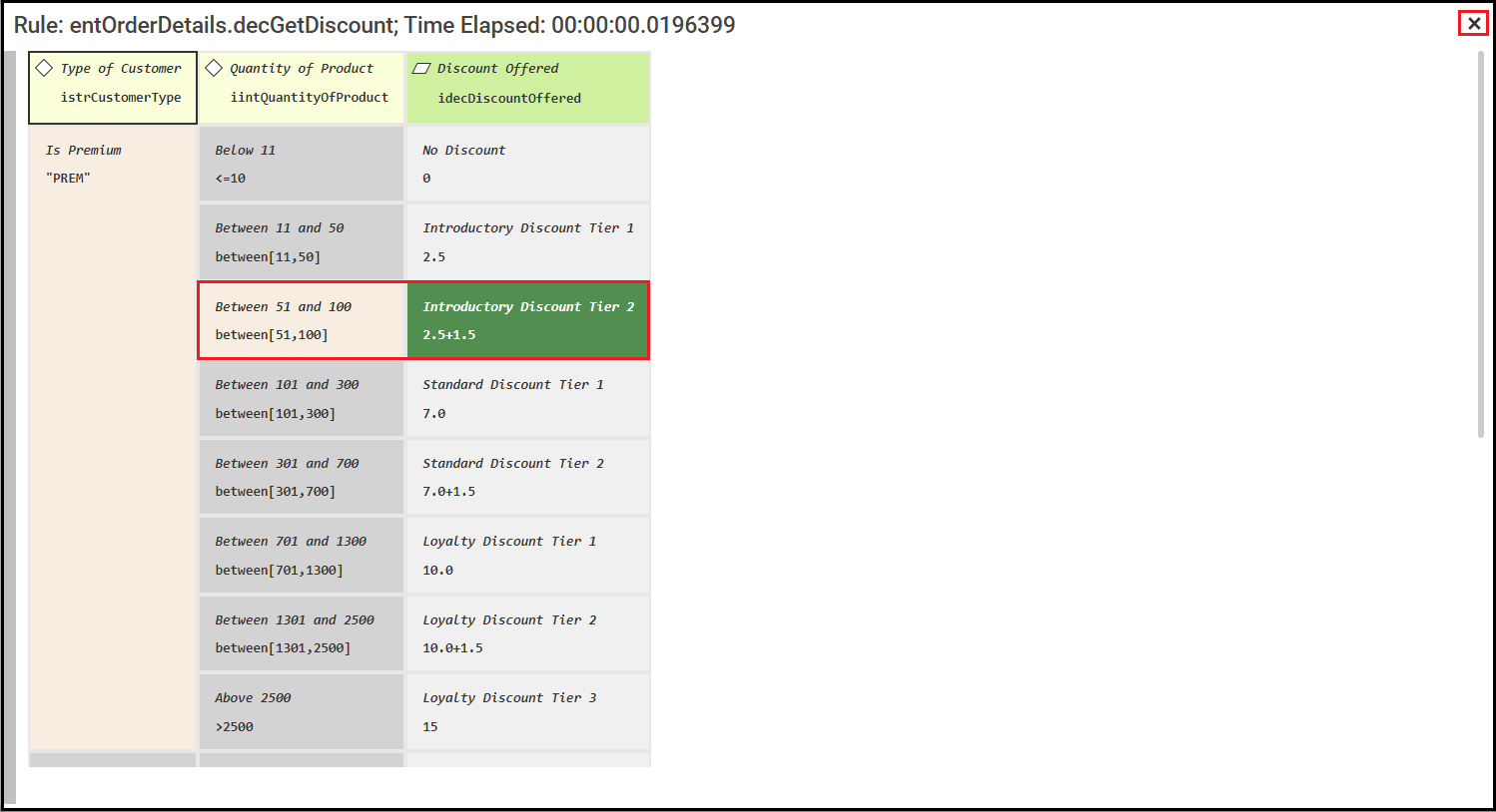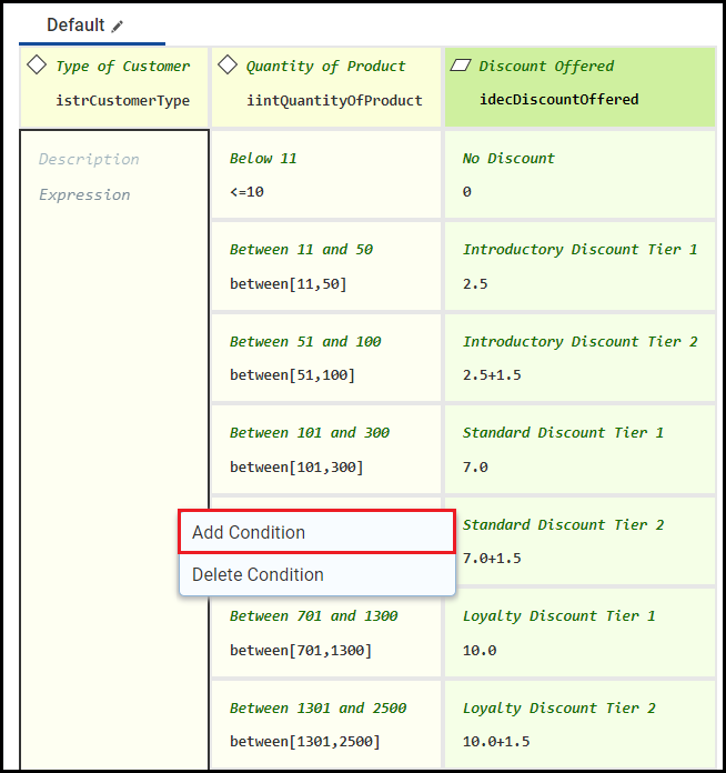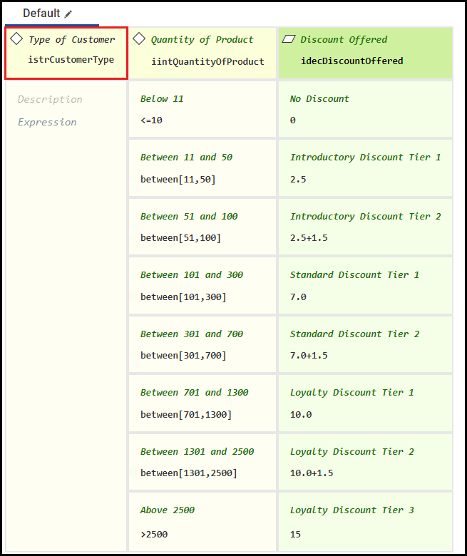 Currently, this decision table only uses the product quantity to determine the offered discount. This example adds another factor to affect the discount: whether the customer type is Regular or Premium.