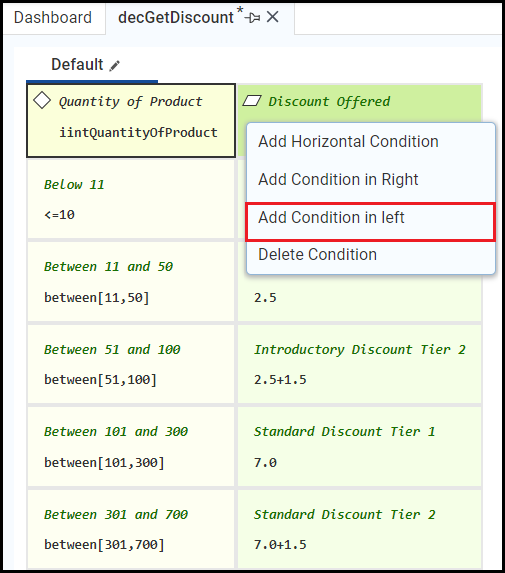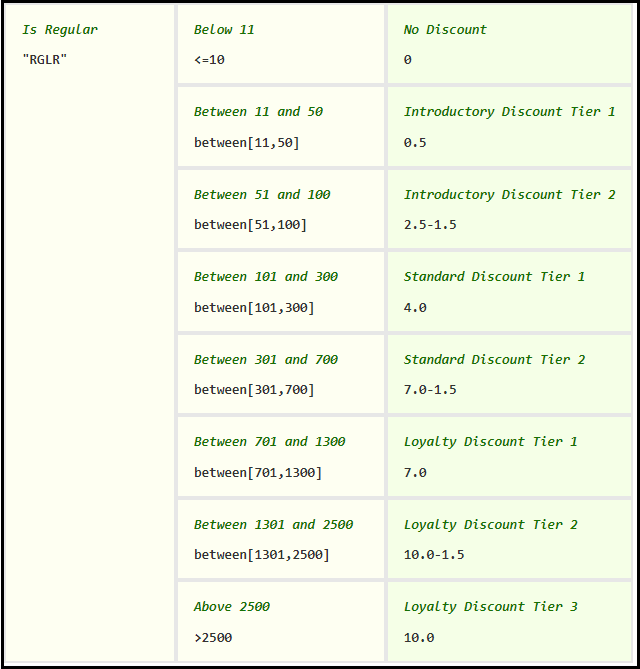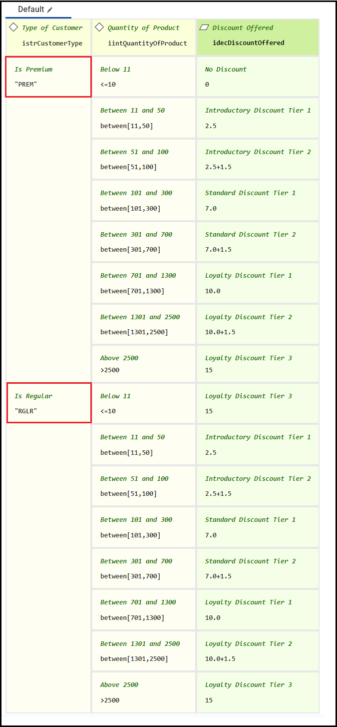 For this decision table, Premium customers will have the already defined discount. Regular customers will have a different discount. This decision table uses the same number of conditions for each customer type, but you can also have fewer conditions: this decision table only has to cover all possible product quantities, not have the same number of possible discounts.