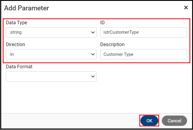 This variable is going to be called "istrCustomerType". The Direction is In and the Data Type is string.