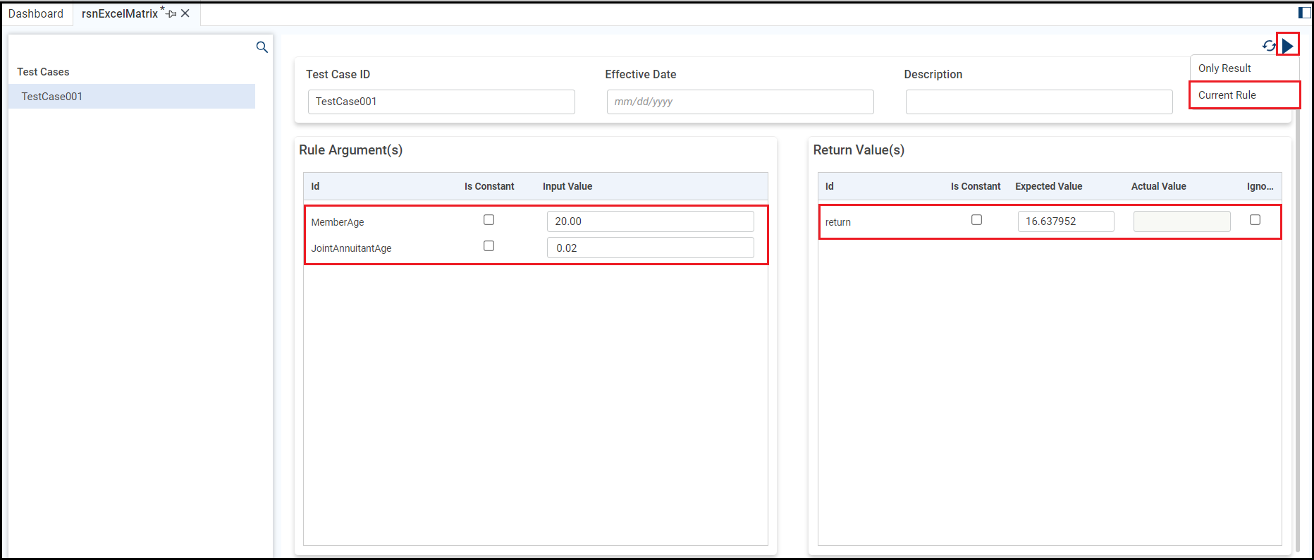 Click the Run Test icon, then Current Rule to execute the rule with the input value(s) you entered.