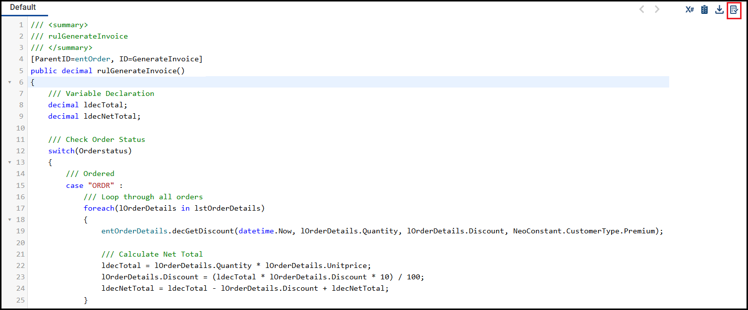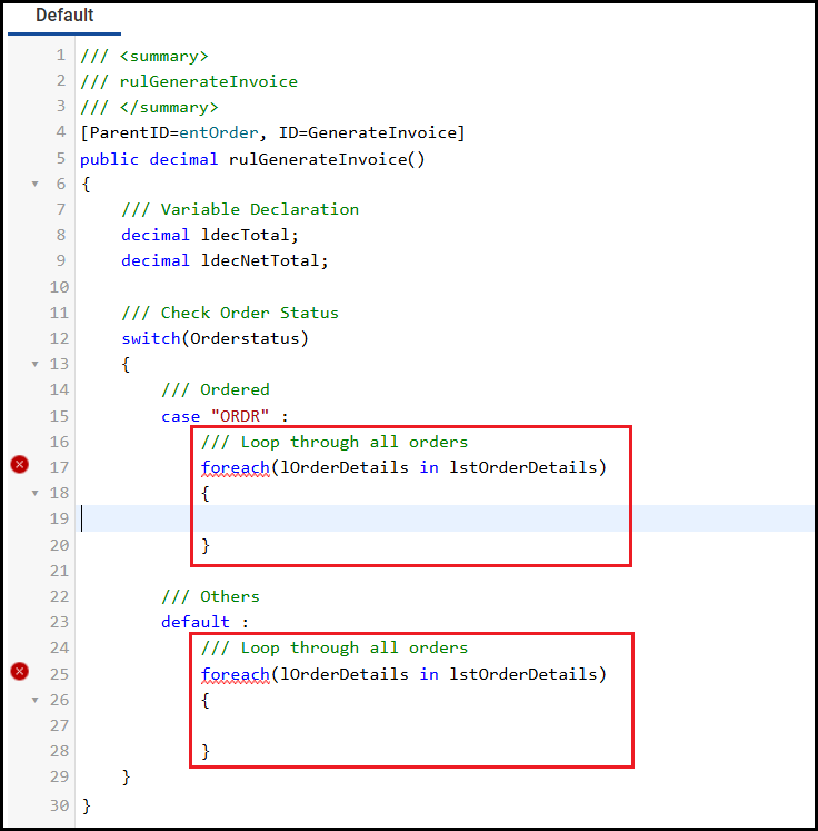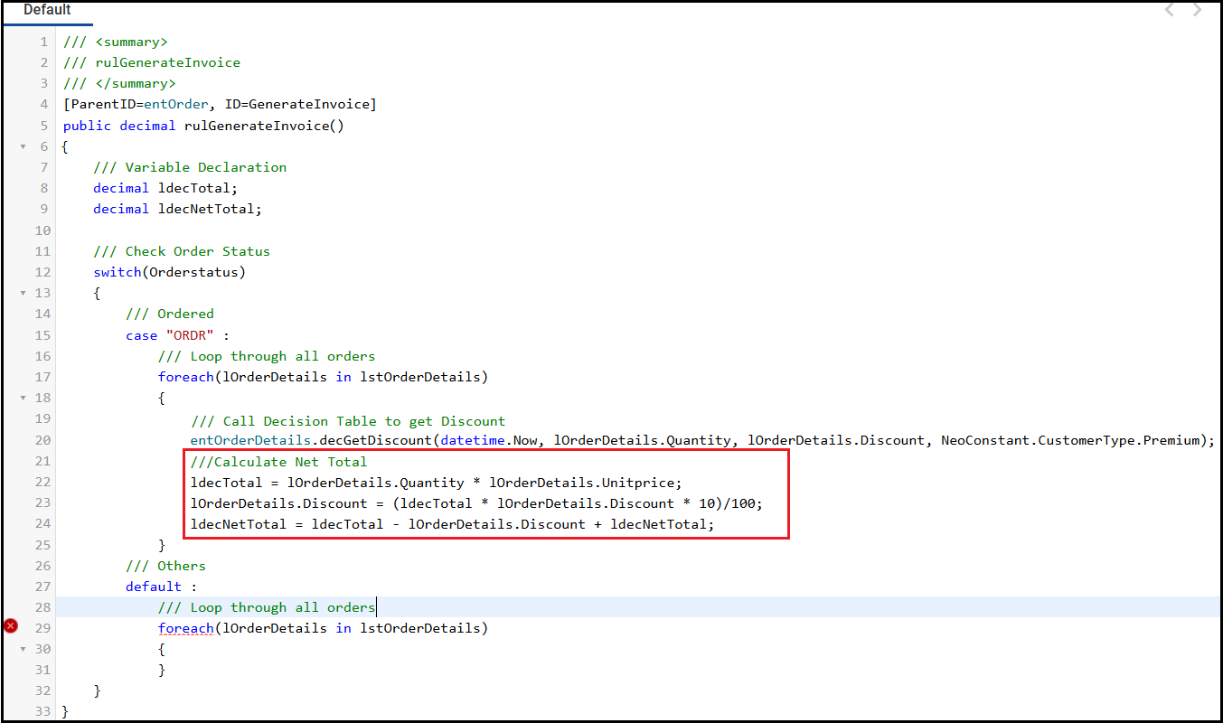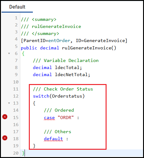 Add a switch block in X# which has one if block and one else block, by default. It checks the order status for each order. If the order status is Ordered, it will calculate the discount. If the order status is any other value, it will set the discount to 0.