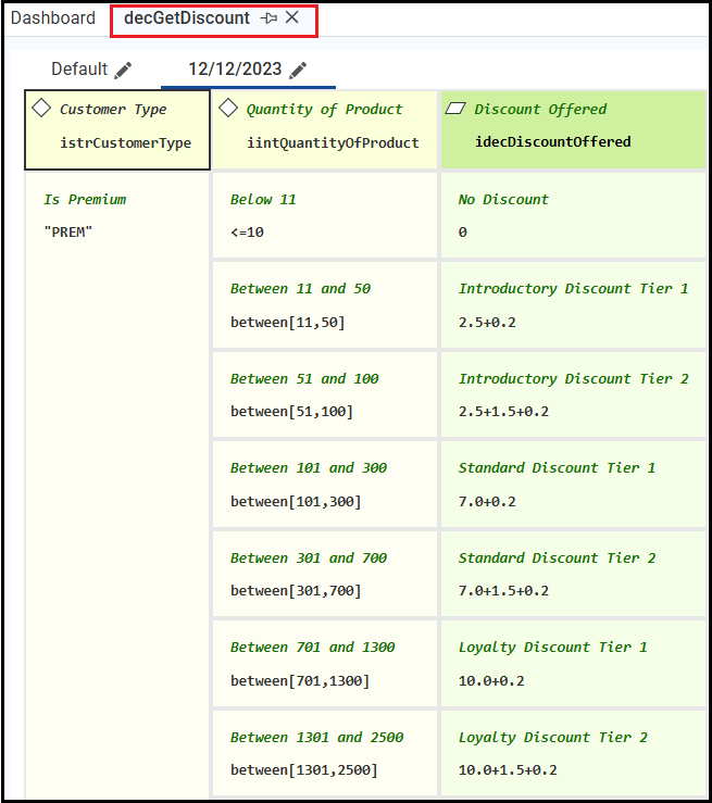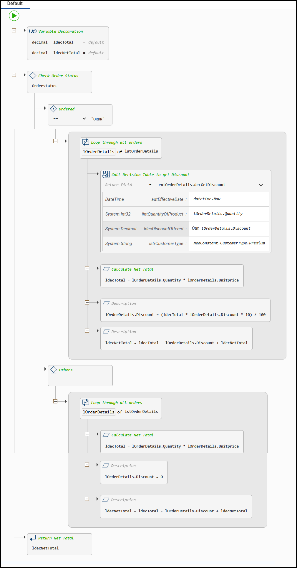 In this example, if the Order Status is ORDR, the value of the offered discount is determined by the GetDiscount decision table. If the order status is not ORDR, the value of the offered discount is 0.