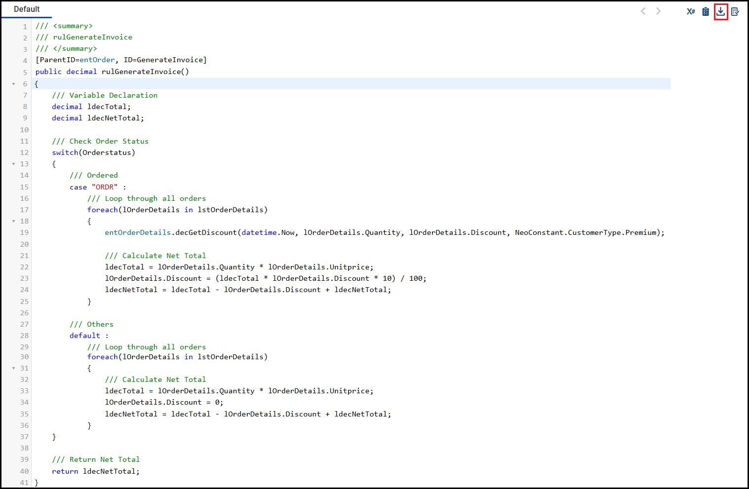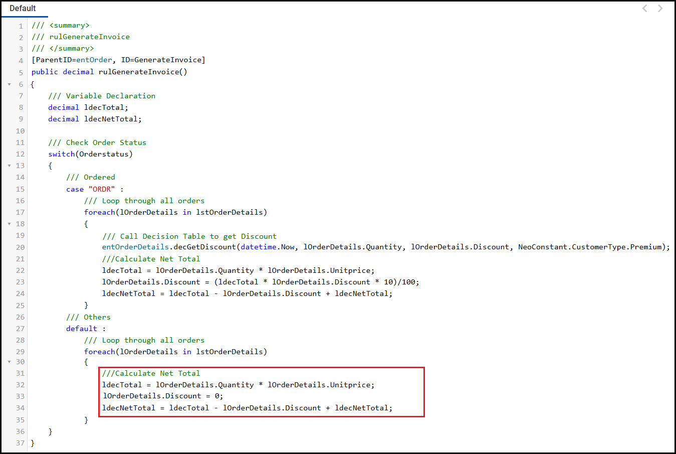 This rule uses two actions to calculate the net total value when the order status is ORDR and when it is not ORDR.